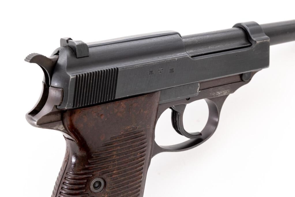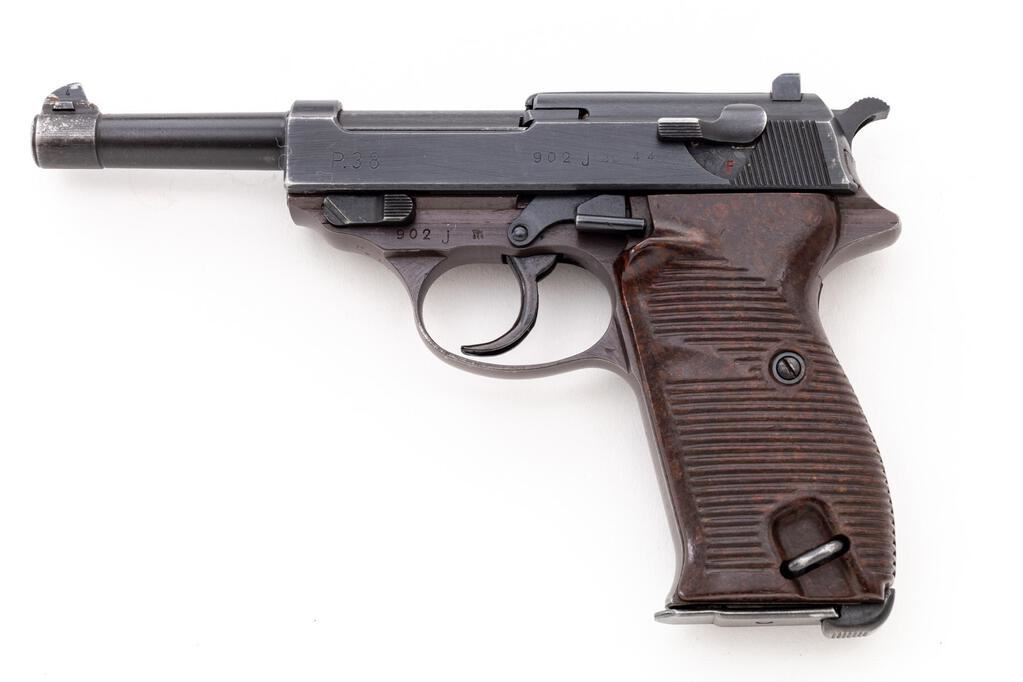WWII German P-38 AC-44 Semi-Automatic Pistol, #902J, 9mm, 5" barrel, blued finish, double action, Nazi eagle firing proof on slide, "(eagle)359" waffenampts on frame and slide, barrel marked on the internal side with "(eagle)359" waffenampt and asterisk, hammer drop safety, drift adjustable blade front sight and fixed rear sight with small "u" slot, all visible numbers matching, lanyard loop, bottom mag release, light brown Bakelite grooved grips, one blued steel magazine marked P.38v, jvd on the side, and jvd with a "(eagle)WaA708" waffenampt on the back spine. Condition is near excellent retaining approx. 90% original blue finish, the frame having a plum color finish, with wear and freckling at the muzzle, top of the round part of the barrel, sides and top of the front sight, light wear on the top of the barrel in the chamber area, very slight high edgewear on the slide, top of the rear sight, and tip of the safety lever. Front grip strap is thinning slightly but still remains strong, with light edgewear on the mag release and lanyard loop. Action, hold open, and hammer drop safety all function properly and would improve with some cleaning and lubrication; bore is bright and shiny. Grips show little to no wear. Magazine is very nice showing only a few light marks from use. Est.: $1,000-$1,500. (C&R/PPT)