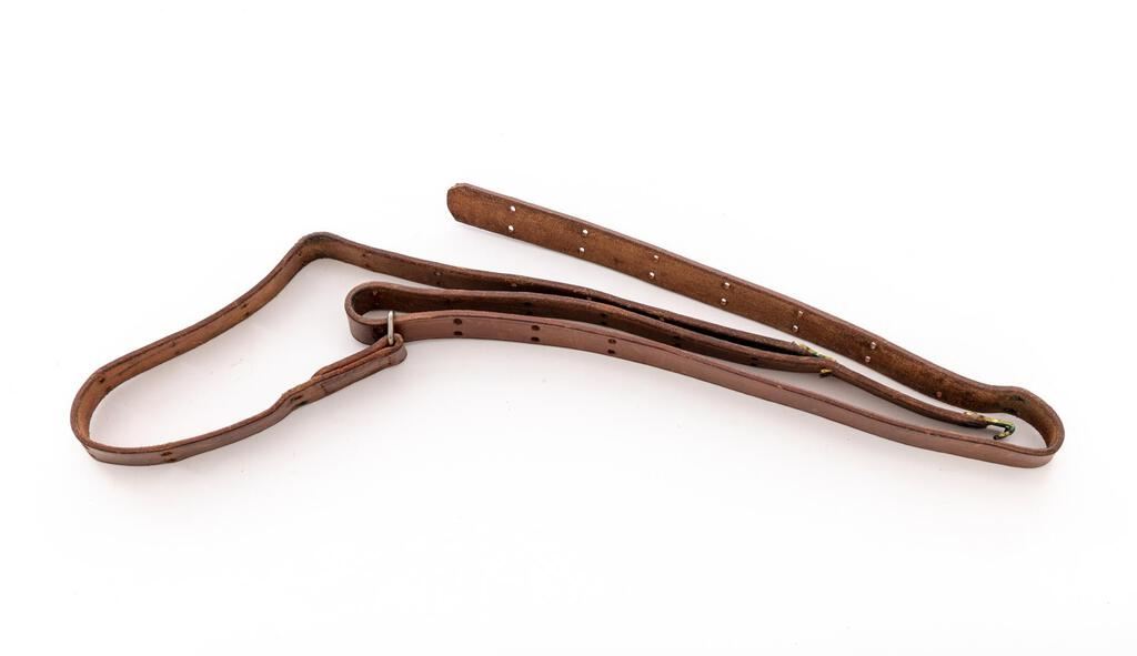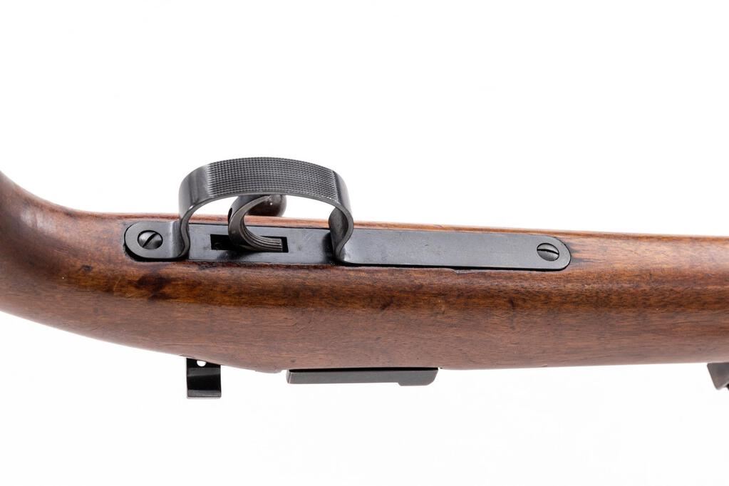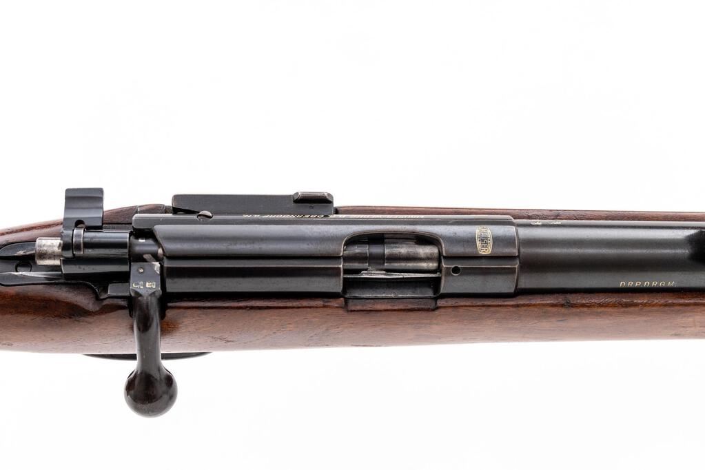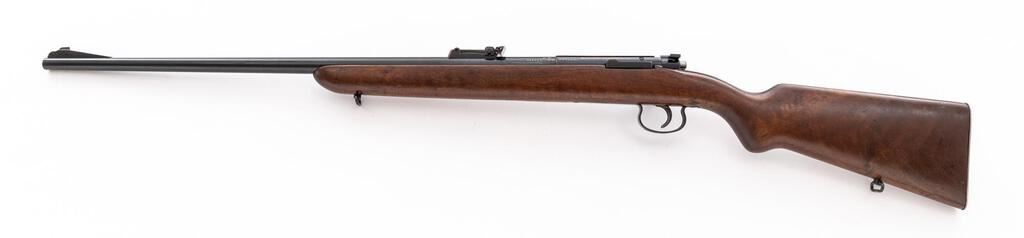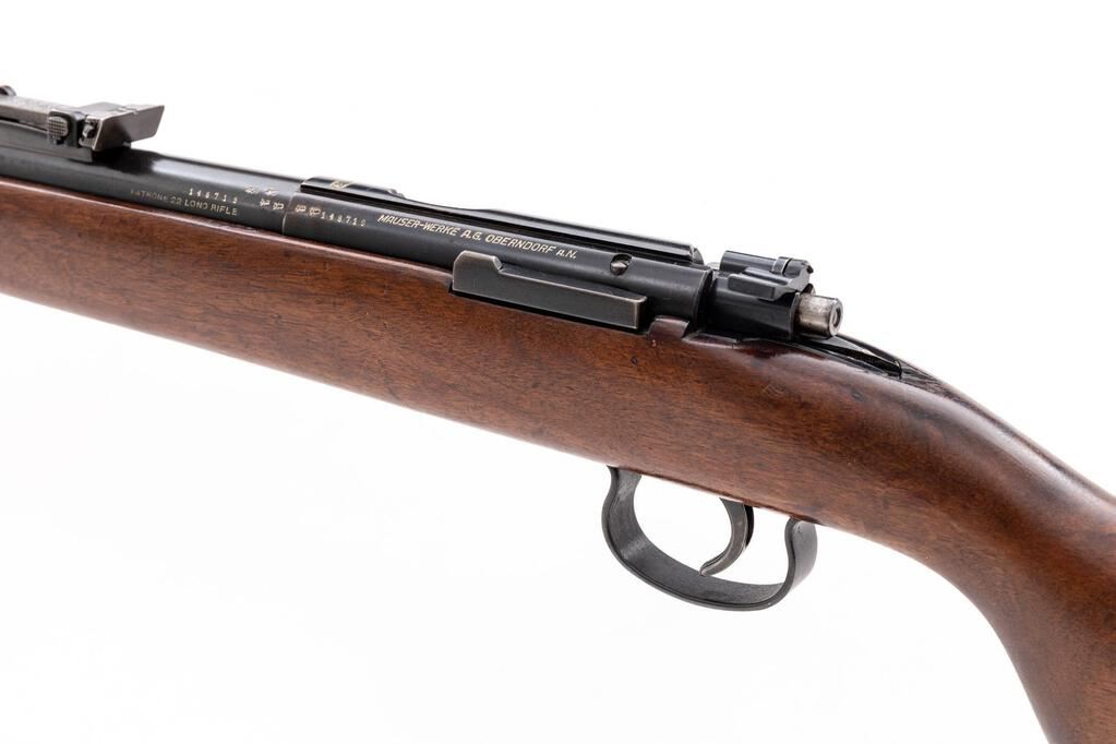 Mauser ES340B .22 Bolt Action Rifle, #148719, .22 LR cal., 26.5" heavy barrel, blued finish, Mauser Banner on chamber, Imperial BUG proof marks, all visible numbers matching, fixed inverted "V" ramped front sight with removable blade, missing the sight hood, and tangent rear sight adjustable from 30-200. Barrel marked "DRP DRGM" and Ch51 (chrome steel marking), receiver is grooved for a scope, one-piece pistol grip stock with Mauser Banner stamp on right side of butt, blued trigger guard with checkered bottom, sling swivels, commercial U.S. style leather sling, and steel buttplate with Mauser Banner. Condition is very good showing an overall thinning to the bluing on the barrel and action, but still presenting very well, with light high edgewear on the rear sight, receiver, wear to the bolt body from use, and light freckling on the trigger guard. Action and safety work properly; bore is bright and shiny. Stock shows age crazing to a light coat of varnish, minor dings, scratches, and small depressions. Rear sling swivel has been ground flat on the center piece and shows a bright finish on that area. Buttplate has been cleaned, shows minor old pitting, and has a light varnish coating. Sling shows age, light cracking, and some verdigris around the brass parts. Est.: $750-$1,000. (C&R)