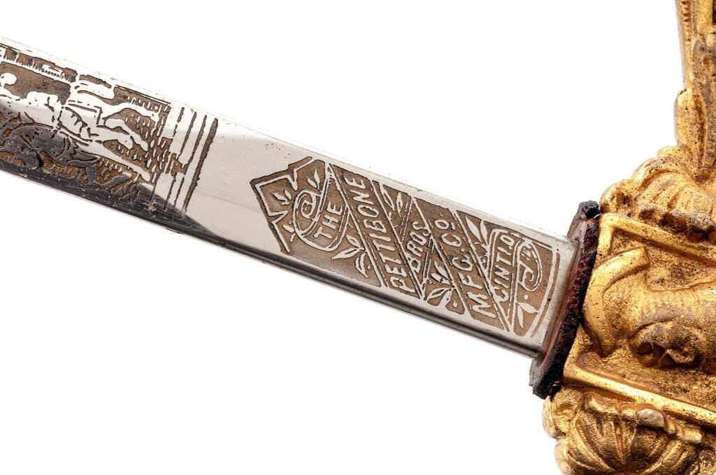 Ornate Knights of Pythias Fraternal Sword, with gold washed fittings and scabbard, knight's head pommel, fancy cross guard with king's head in center panels, decorated bone grip, etched decorated blade, with gold wash featuring floral designs and knights on horseback, mfg'd by the Pettibone Bros. Mfg. Co. in Cincinnati Ohio. Decorated scabbard with knight, crown, red enamel crosses, monogram letters, and decorative drag. Blade has etched name to "Wm. H. Schroeffel". Condition is very good showing light age and wear to the sword fittings, a few tight hairlines on the grip, light age and minor edge nicks to the blade. Original leather blade washer is present, with light age, minor scratches and wear, and a few small dings to the scabbard. Blade length is 30", OAL is 39". Est.: $150-$200.