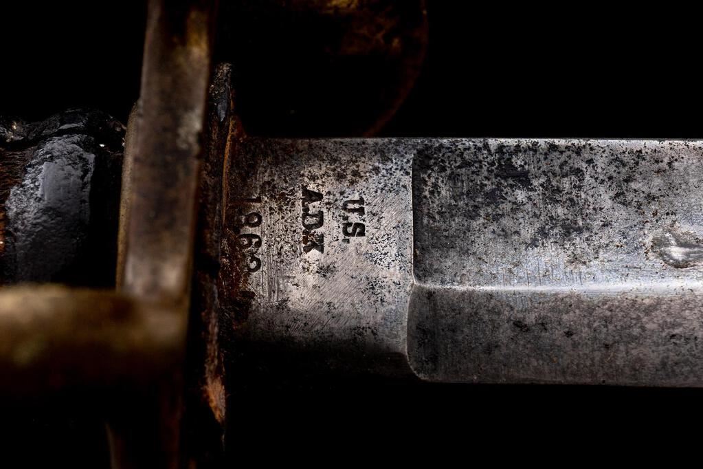 Civil War U.S. Model 1860 Enlisted Cavalry Sword, by Ames, with Scabbard, 34.5" blade with one wide and one narrow fuller, faint Ames maker mark on ricasso, other side of ricasso marked "U.S., A.D.K., 186(3?)", with three-branch brass guard, pommel marked "A.D.K"; grooved wood grip is missing most all of its leather covering and the wire, quillon is bent down with stamped rack number "40". Steel scabbard with two hanging rings has been bead blasted, faint large number "15" stamped on the drag. Condition is fair, the blade showing age graying, minor pitting, flattening of the edge in the middle (probably to remove edge nicks), and minor rust. The original leather blade washer is present but split. Main branch of the guard is bent, and the outer branch is slightly bent. Brass has a dark uncleaned patina. Wood handle shows several cracks, has only a small remnant of the leather covering, and is missing the wire wrapping. Scabbard has been cleaned and bead blasted to mostly bright, with scattered medium to heavy pitting overall, and two large dents between the hanging rings. Est.: $250-$400.