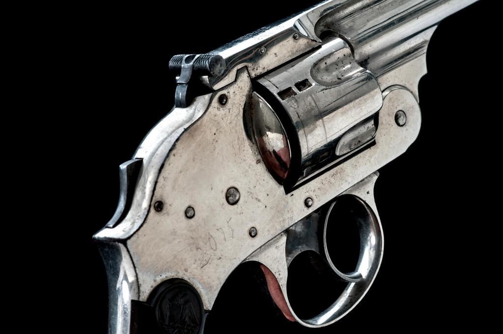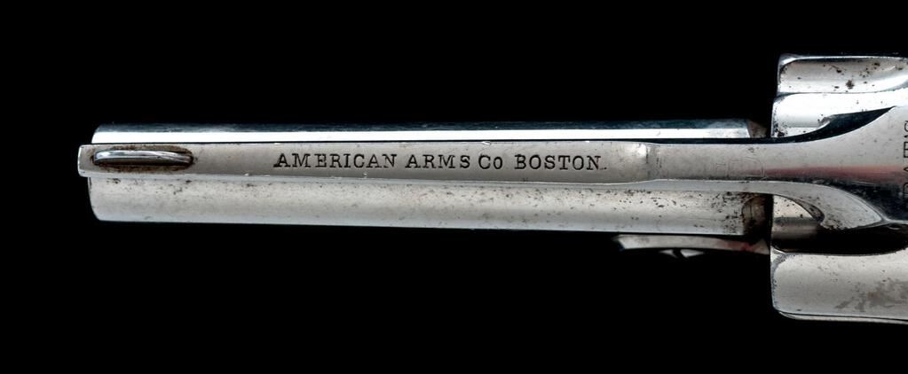 American Arms Co. Top-Break Hammerless Model 1890 SA/DA 5-Shot Revolver, NSNV, .38 S&W cal., 3.25" ribbed barrel, round blade front and fixed rear sights, hammerless, extractor, nickel finish, checkered two-piece hard rubber eagle grips, 5-shot fluted cylinder with selector switch on left side of frame. Top of barrel rib is marked "AMERICAN ARMS CO. BOSTON/PAT. MAY 25, 1886/Mar. 11'89/JUNE 17'90", indicating production prior to 1897, when the company moved from Boston to Chicopee Falls, MA. Mfg'd 1890-1901. Revolver is in near fine overall condition retaining approx. 85%-90% flaking nickel finish with light scratches, edgewear, a freckling of light surface rust on the left frame, and double index lines on the cylinder. Trigger shows muted case coloring. Left side of frame features a unique selector switch, allowing the user to choose either single or double action. Additionally, there is a manual safety behind the locking catch, above the rear grip strap. Grips are very good and fit well. Action works well, bore is fair with defined rifling. Est.: $150-$250. (Antique)