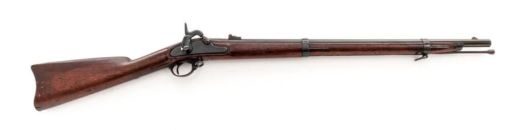 Springfield Model 1861 Single-Shot Percussion Shortened Rifle, NVSN, .58 cal., 28" round barrel with standard sights, marked "Y&C" at left breech; 1863-dated Springfield lockplate and hardware are correct Civil War M-1861 rifle pieces, as is the oil-finished 2-band walnut fullstock. Steel tulip-head ramrod. As with many surplus military arms at war's end, this rifle was likely purchased at a government auction by an arms dealer?perhaps "Y&C" in this case?shortened and lightened, then re-sold for civilian sporting use. Condition is good to very good as configured, having been refinished in blue some time ago while retaining good edges and markings. Stock is sound showing 2 vacant screw holes at top of wrist (probably for a tang sight), light marks and two inspectors' cartouches (incl. "ESA") opposite the lock. Action is crisp, bore shows cleaned frosting and good rifling. Est.: $400-$600. (Antique)