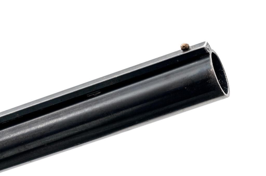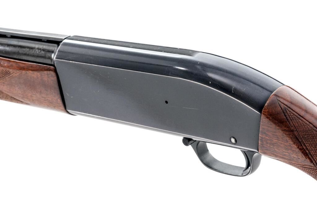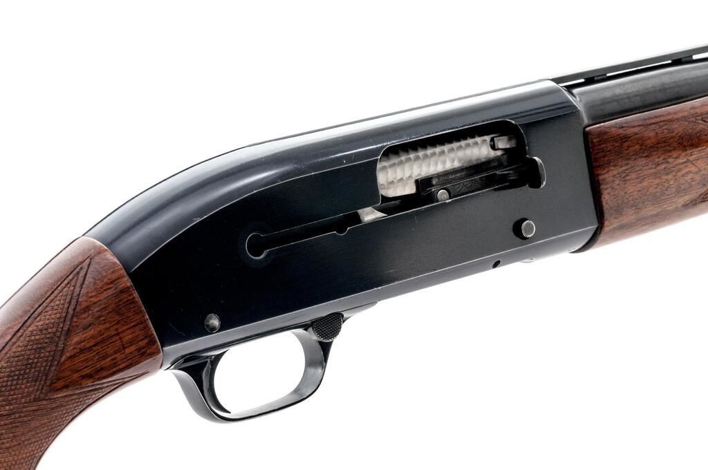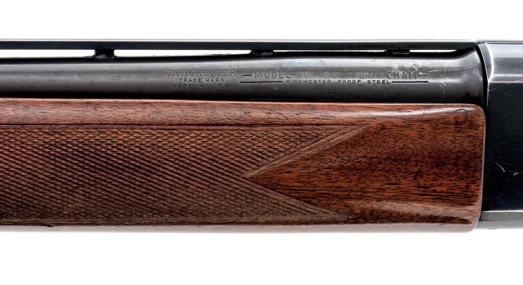 Late Winchester Model 50 Standard Grade Semi-Automatic Shotgun, #156120A. 12 ga. 30" vent rib barrel has center bead, 2-3/4" chamber, and is choked Full. The action is recoil-operated, with large safety button and machine-turned bolt and shell lifter. The full forend and pistol grip buttstock are high-gloss finished straight-grain walnut, with adequate checkering and correct Winchester buttplate. Mfg'd in 1960. Condition is very good, showing field use but no abuse. Wood has a few small handling marks, metal has expected bluing wear on receiver edges and contact areas. Action functions correctly, bore is good. Est.: $400-$500. (C&R)