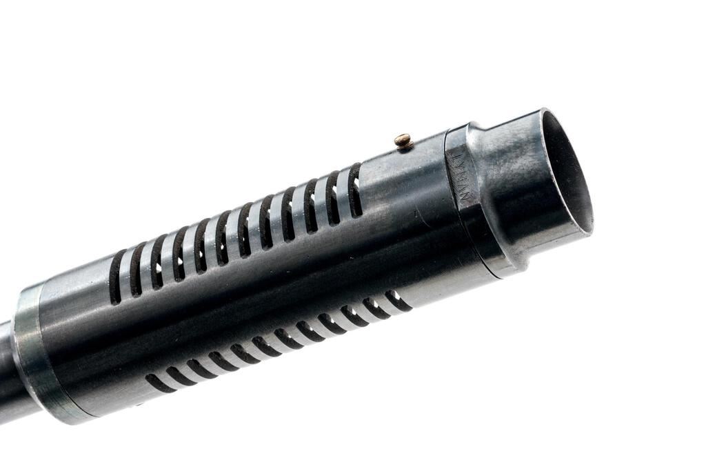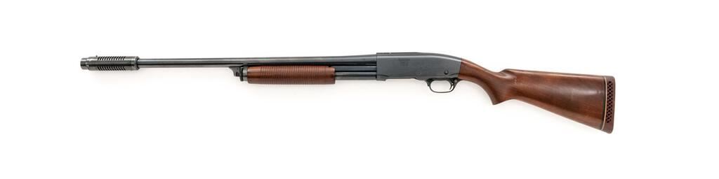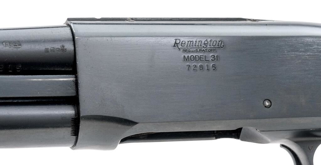 Remington Model 31A Field Grade Slide-Action Shotgun, #72815. 12 ga. 25" plain barrel has a 2-3/4" chamber and is fitted with a Lyman "Cutts Compensator", with spreader choke tube installed. The Model 31 action is quite smooth, the receiver has been drilled and tapped for a sighting device. The ribbed forend and uncheckered buttstock are walnut, with a Mershon recoil pad fitted. Mfg'd 1946. Condition is good to very good, with several marks to buttstock but little wear to action, which locks tight and functions correctly; bore is bright. Est.: $200-$400. (C&R)