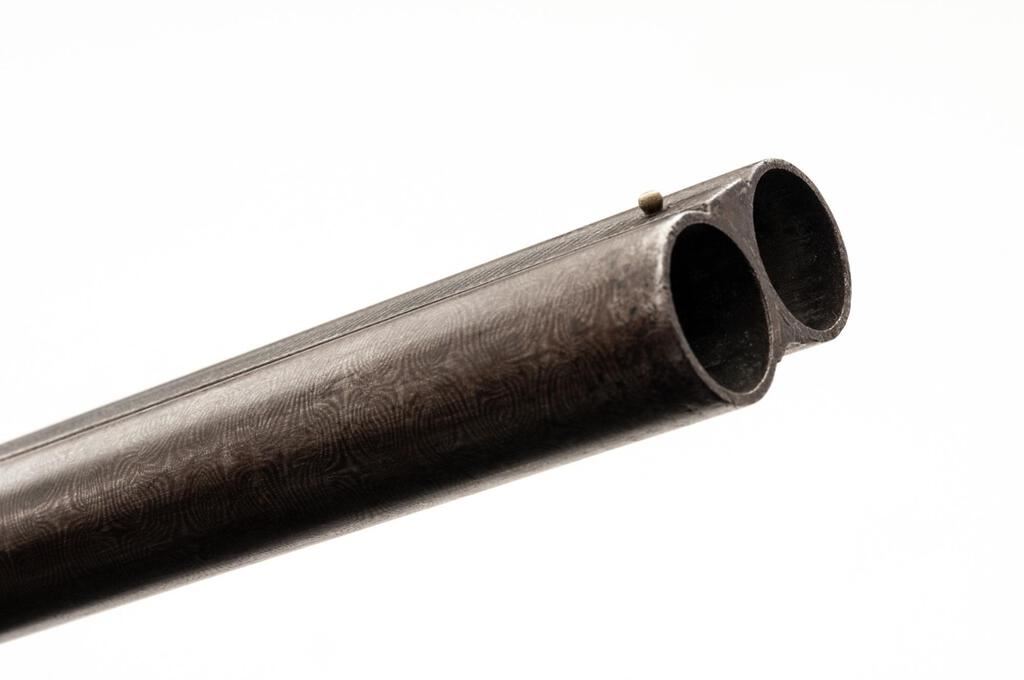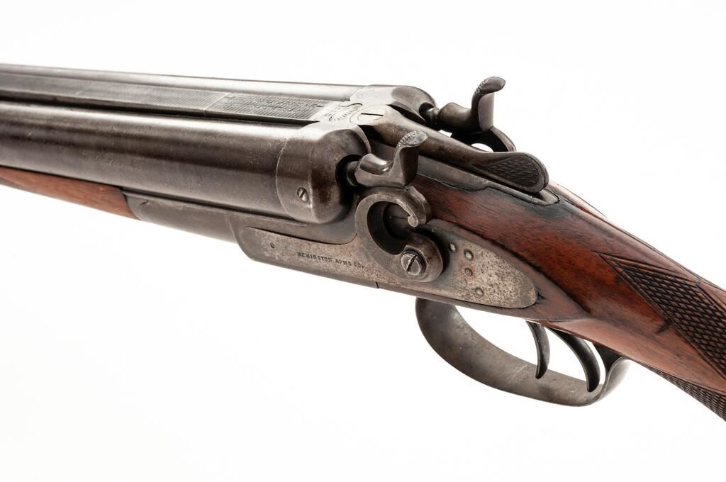 Remington Model 1889 Grade 3 Hammer-Type Side-by-Side Shotgun, #224323. 12 ga. 32" solid rib Damascus barrels have 2-3/4" chambers and are choked IM/IM. The 1889 action features lockup via dual underlugs plus doll's head rib extension, dual hammers and triggers, and simple extractors. The lockplates are unengraved except for the maker's stamp. The splinter forend and Prince of Wales round-knob pistol grip buttstock are oil-finished walnut and feature an ebony forend tip and good coverage of checkering; buttplate is missing. Mfg'd approx. 1902. Condition is good, with wood either refinished or replaced. Action closes tight but the action lever has a broken spring. Locks, triggers and hammers function correctly, as does the extractor. Approx. 50% faded Damascus finish remains, receiver has gone to a dull patina; bores are pitted. A good candidate for a restoration. Est.: $400-$500. (C&R)