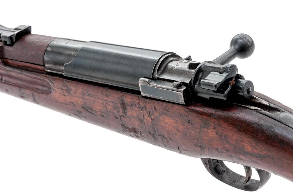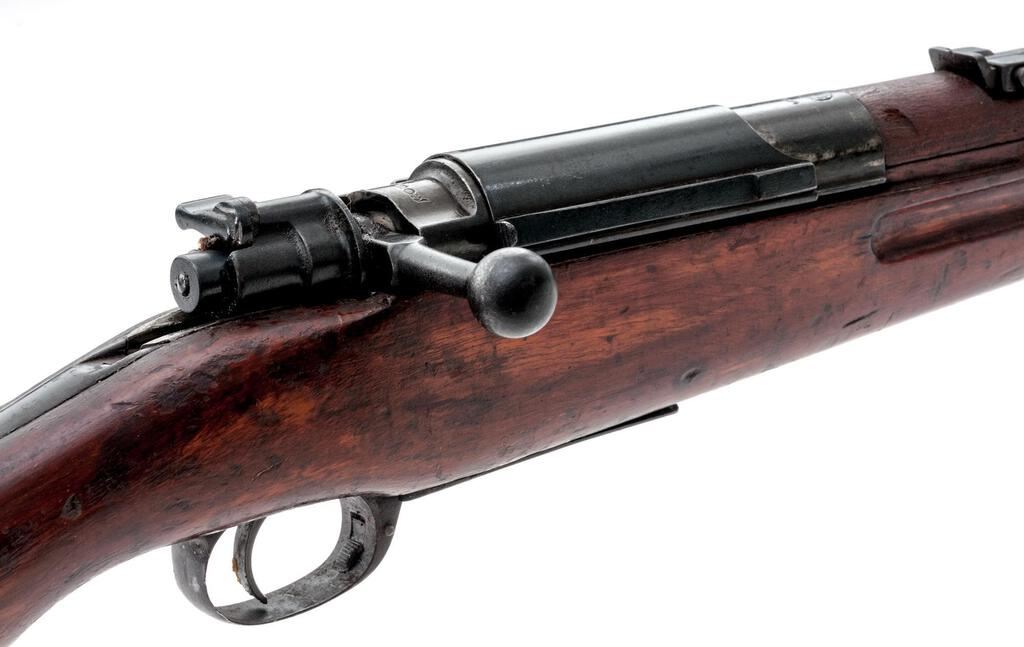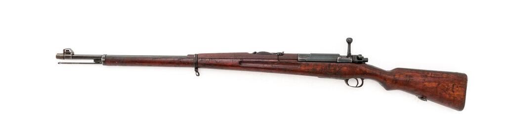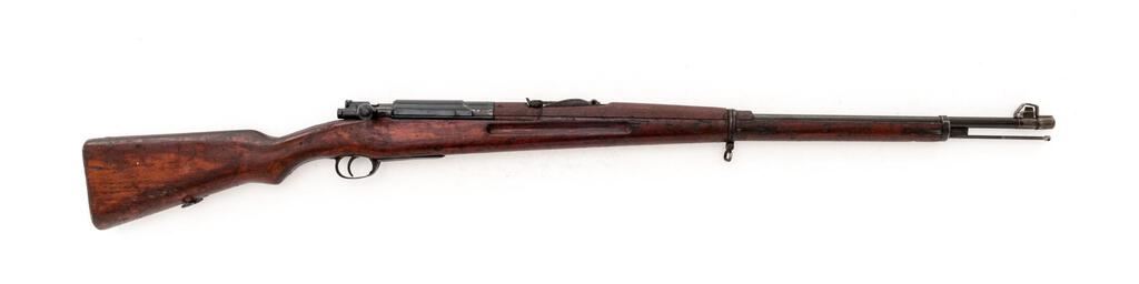 Siamese Type 46 Mauser Bolt Action Rifle, #2232, 8x50Rmm, 29.8" barrel, blued finish, hardwood stock set, inverted "V" front sight and adjustable tangent rear sight. An excellent condition sliding steel dustcover and a good condition spring steel muzzle cover are attached. Cleaning rod is mounted under the barrel but will not screw fully into position. Marked on top of receiver ring with the crest of King Rama VI over model type. Thai character serial number on rear receiver bridge. Condition overall is good with the metal retaining approx. 80% finish, showing rust to the rear sight and patina to the magazine floorplate and along the barrel wood line. Hand guard appears to be a replacement, and there is a small crack to the right-side forend below the rear sight. Wood is good otherwise with new and old bruises to the dark finish. Action operates smoothly, bore is poor with barely visible rifling. No visible import marks. Est.: $500-$700. (C&R)