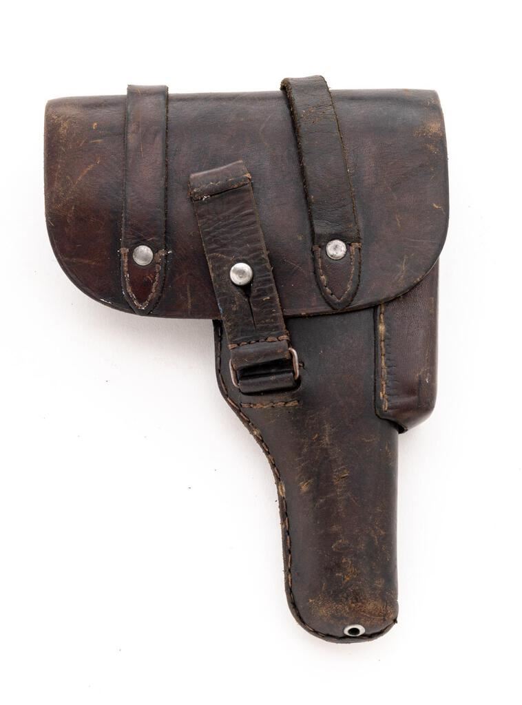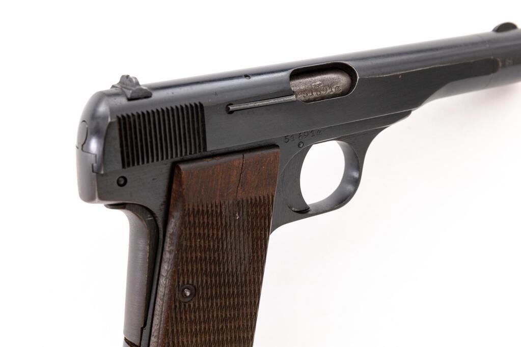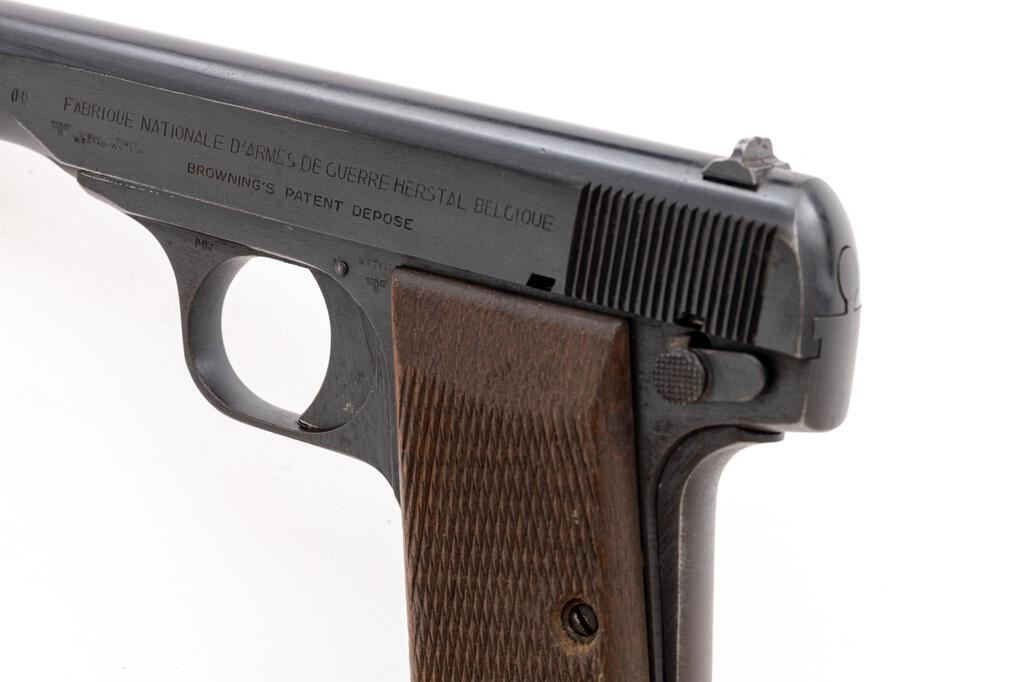 WWII German Marked Browning Model 1922 Semi-Automatic Pistol, with Holster, #51691a, .32 ACP cal., 4.4" barrel, blued finish, Nazi eagle firing proofs on frame, slide, and barrel; "(eagle)WaA140" waffenampts on slide and frame, slide marked with Fabrique National address and Browning patent info, all visible numbers matching, thin blade type fixed front sight and drift adjustable fixed rear sight with "V" notch, grip safety, magazine safety, checkered wood grips, two (2) blued steel magazines marked with FN, FN logo, and 7.65. Includes a dark brown German dropping holster with ink stamp on underside of top flap that reads "Nur fur Lange Browning-Pistol, Kal. 7.65", and a "Weimar(eagle)2" stamp on the outside of the top flap. Condition is good retaining approx. 75%-80% original blued finish, with wear at the muzzle sides, tops of the sights, minor rust spots around the rear sight on the slide. Trigger guard front has light freckling, the front and rear grip straps are thinning and fading to brown, the barrel is in the white and shows age graying and light rust at the chamber area. Action and safeties function properly, bore is bright and shiny. Grips show age, darkening and light wear, with the right grip having a large dent, small gouge, and a hairline crack at the top. Magazine in the gun shows a dark matte finish with wear and lines from use; the other magazine shows wear and lines from use, and freckling on both sides and the base. Holster shows age and darkening to the leather, scuffs, scratches, small gouges, and soiling. Est.: $500-$700. (C&R/PPT)