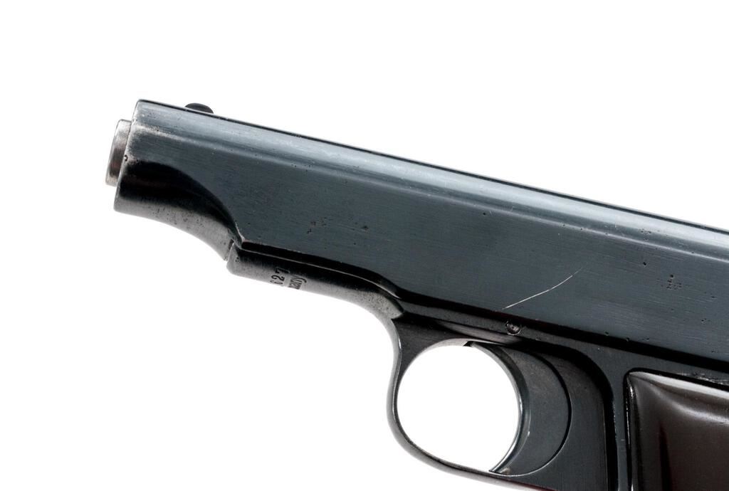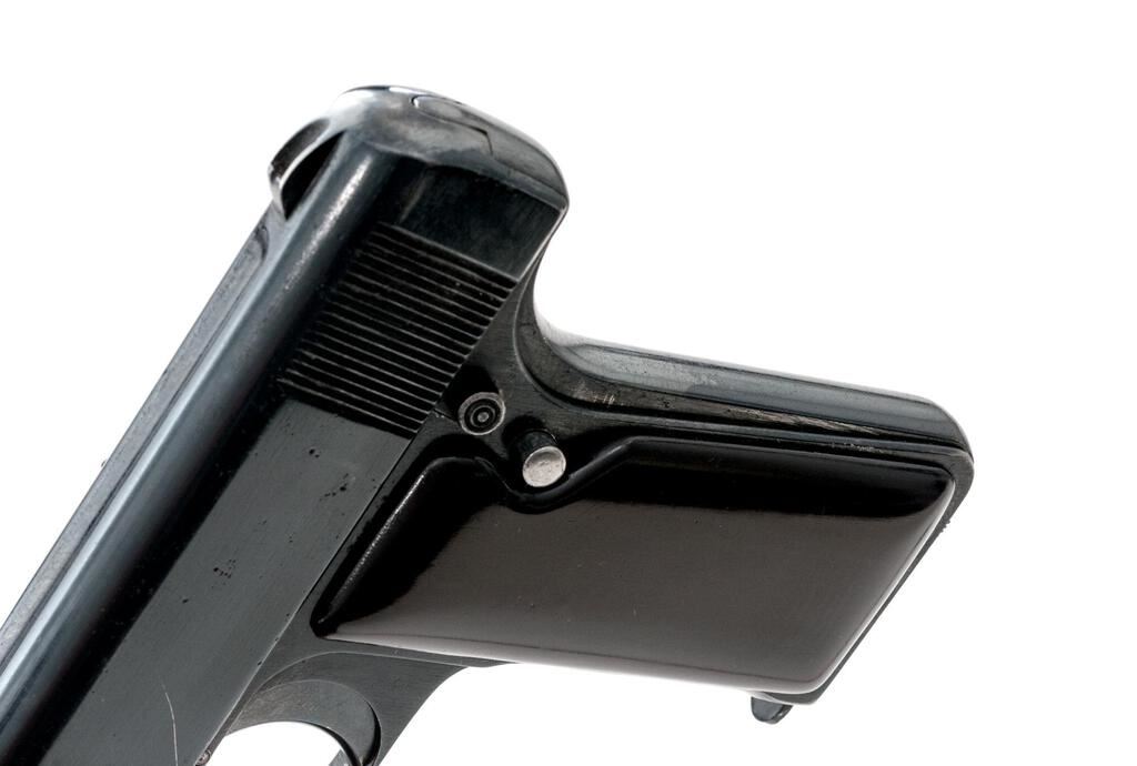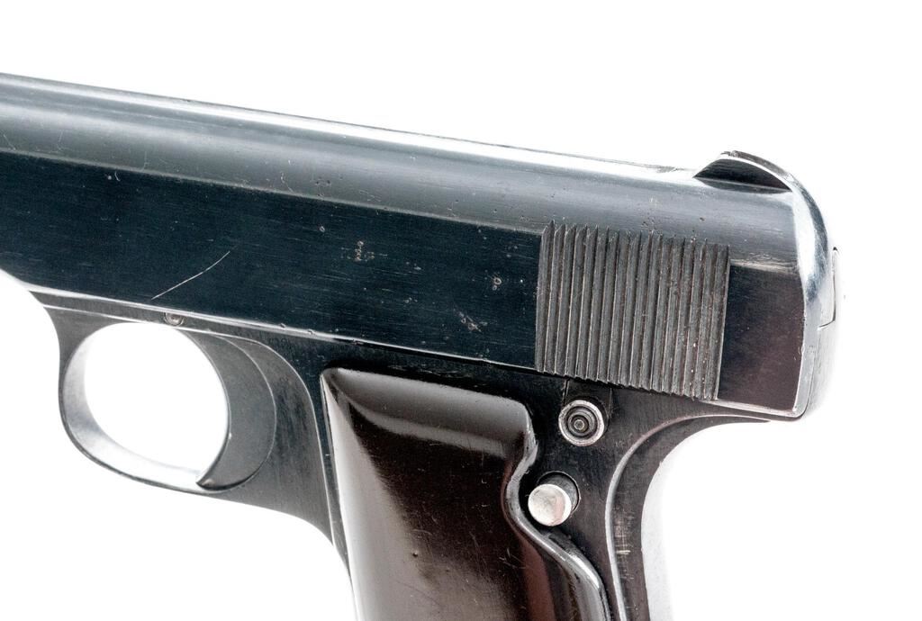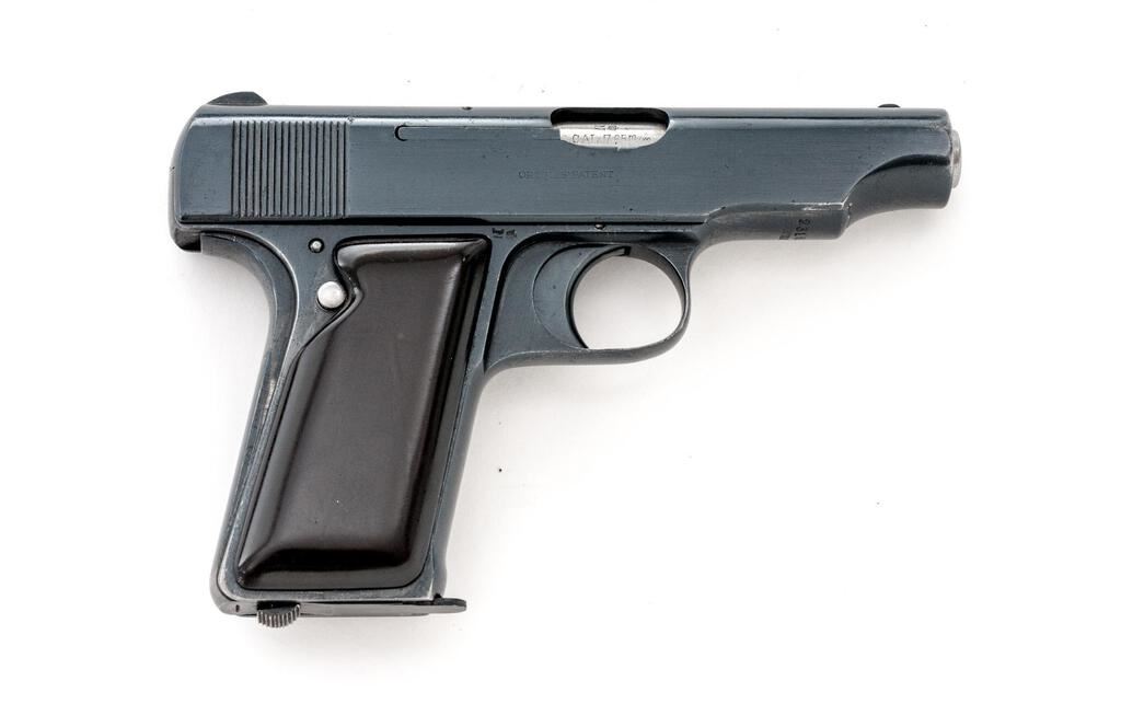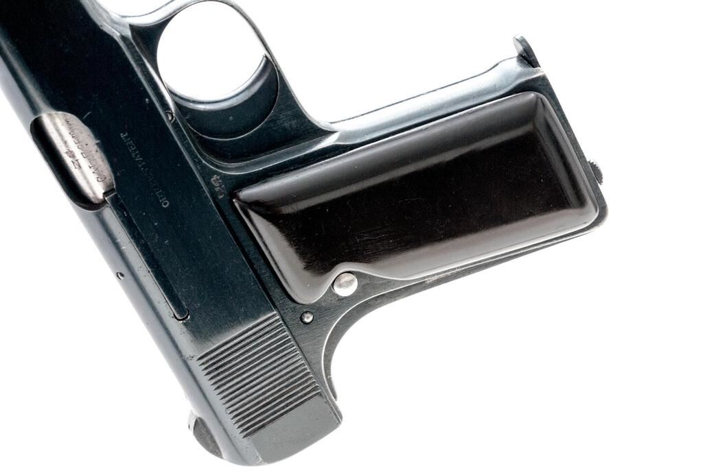 German Ortgies Semi-Automatic Pistol, with Extra Magazine, #231627, .32 ACP cal., 3.4" barrel, blued finish, brown plastic grips, blade front sight and fixed rear sight with "U" notch. Magazine #1 has seven witness holes and is marked on the floorplate with the Ortgies trademark long tail cat logo and "CAL. 7.65". Condition is good retaining approx. 60% nickel finish now showing dark spots and patina. Magazine #2 has six witness holes and is unmarked. Condition is very good showing light finish wear. Pistol markings have been removed from left-side slide; right-side slide is marked "ORTGIES PATENT". Barrel is marked "7,65 mm" at ejection port. "(Crown)N" proofs are stamped on barrel and right-side frame. Condition overall is good retaining approx. 90% of the reblued finish, which was applied over old pitting, now showing patina and wear to the front and rear grip straps. The replacement plastic grips have no logo attached. Condition is very good showing light handling marks. Action operates smoothly; bore has darkening in the grooves and an area of old patina, otherwise good with very good rifling. Est.: $250-$450. (C&R/PPT)