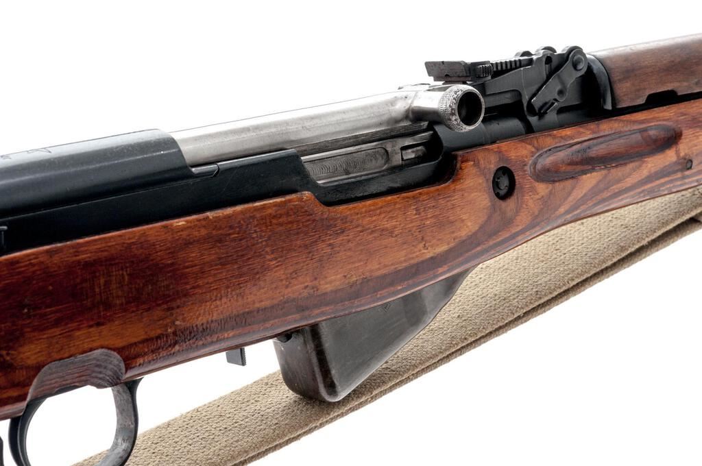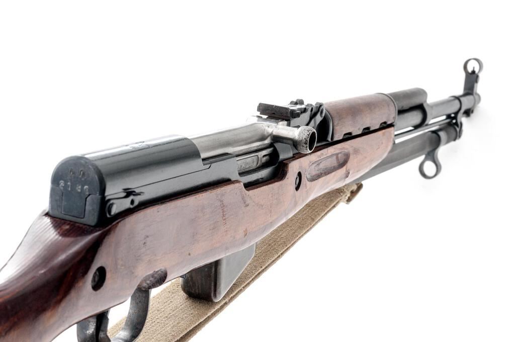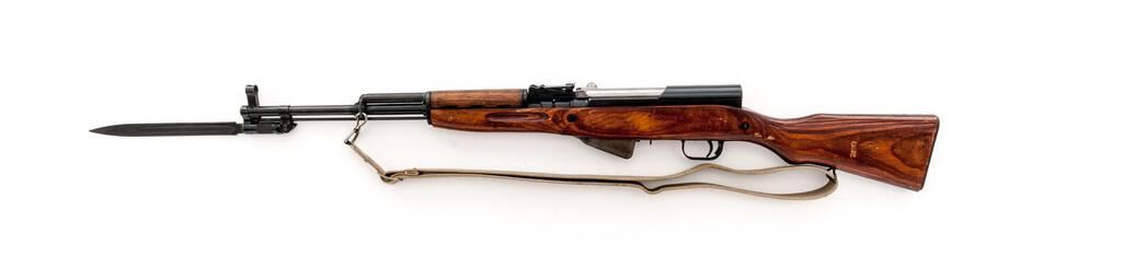 Rare Tula Arsenal Soviet SKS Semi-Automatic Carbine, with Folding Bayonet, #RL005513, 7.62x39mm, 20.5" barrel, blued finish, bright bolt carrier, laminated stock, hooded post front sight and adjustable leaf rear sight. Cleaning rod is mounted under the barrel, and the cleaning kit is inside the butt trap. A good condition Soviet cotton sling is attached. Bayonet blade has dark finish. Marked on top of receiver cover with the Tula Arsenal fletched arrow inside a five-pointed star over "1954r". Matching original Cyrillic serial number (AN2180) on bolt carrier, receiver cover, trigger guard, and (crudely scratched) on the left side of the re-numbered buttstock. Magazine is marked "464069" on the left side and appears to be a replacement. Condition overall is very good with the metal retaining approx. 80% finish, showing most of the bluing removed from the magazine and rust spots on the exposed barrel and trigger guard. Hand guard has been sanded smooth and left unfinished, now in good condition. Stock is very good showing areas of flaking to the dark shellac finish along with handling marks and scratches. Action operates smoothly, bright bore is excellent with sharp well-defined rifling. Bayonet is excellent and locks firmly into position. Import marked on left side of receiver. Est.: $800-$1,100. (C&R)