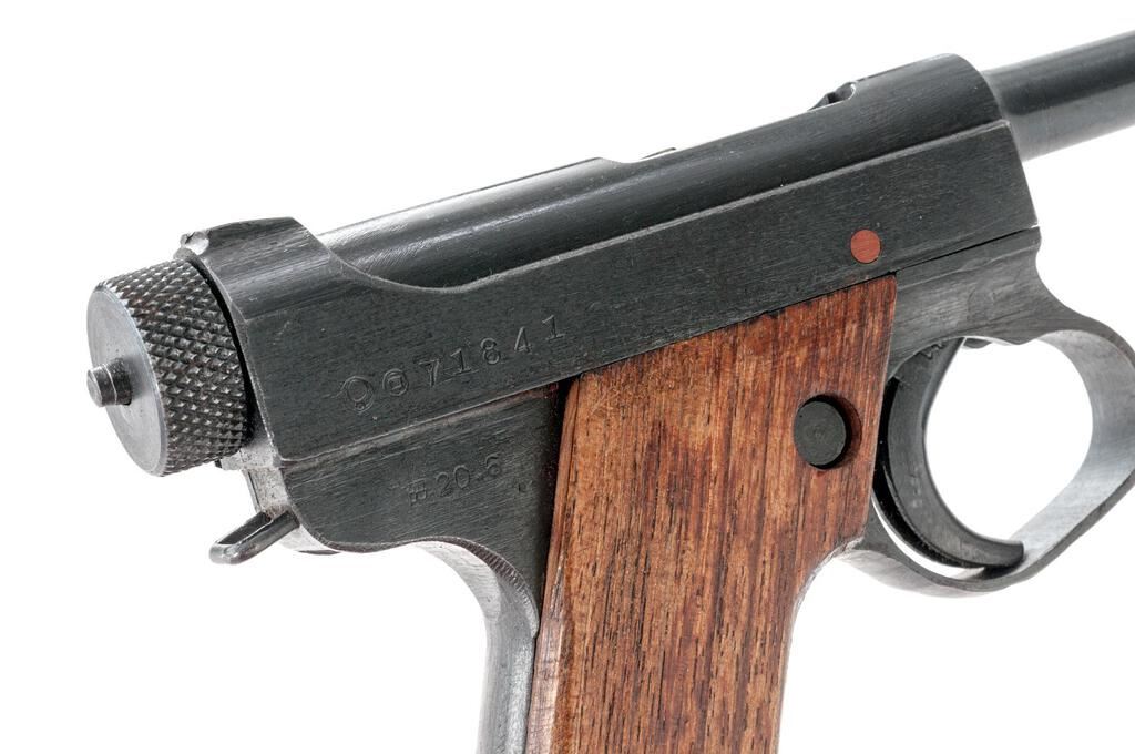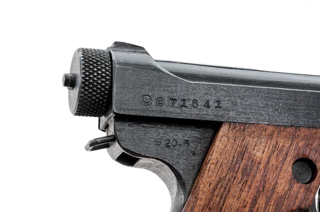 Late WWII Japanese Type 14 Nambu Semi-Automatic Pistol, #71841, 8mm Nambu cal., 4.75" barrel, blued finish, all visible numbers matching except magazine, Toriimatsu factory of Nagoya Arsenal proof marks, dated Showa 20.6 (June 1945), large trigger guard, drift adjustable inverted "V" front sight and integral fixed rear sight with square notch, coarse knurled cocking knob, and lanyard loop. Smooth mahogany wood grips are numbered to the gun, with one non-matching number blued steel magazine with pot metal base. Typical last ditch, crude, rough machining lines and finish to frame and most of the parts. Condition is excellent retaining approx. 97% original war-time blued finish, with minor holster wear at the rear of the slide, wear marks from firing on the top of the slide, slight wear on trigger guard edges, and minor light freckling on the underside of the barrel. Grip straps are just slightly thinning with typical half-moon scratches around the safety lever area. Action, hold open, and safety all function properly; bore is mostly bright with just a hint of frosting, that may improve to mint with a good cleaning. Grips show only light age and use, with minor scratches and light dings; grip screws show light wear and clean slots. Magazine shows wear lines from use and light freckling, with oxidation to the base. Overall, a very nice example, made only two months before the end of the war. Est.: $600-$800. (C&R/PPT)