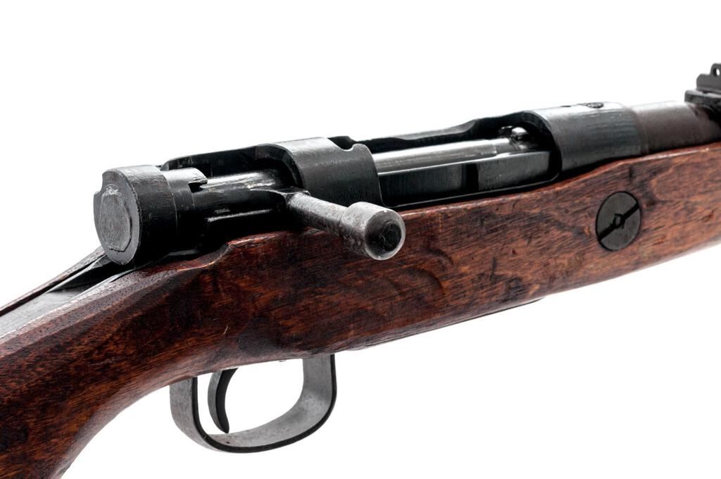 Last Ditch Japanese Type 99 Arisaka Bolt Action Rifle, #13821 ,7.7x58mm, 25.5" barrel, blued finish, two-piece hardwood stock, inverted "V" front sight without protectors and fixed rear sight with aperture. Rifle is Last Ditch type with wooden buttplate, simplified bolt handle, and forend without provision for cleaning rod. Marked on top of receiver ring with intact Mum crest but without model number. Stamped on left-side receiver with an Eighth Series mark and the symbol for the Nagoya Arsenal. Matching numbers on bolt handle and extractor. Condition overall is good with approx. 50% of the metal frosted with a rust patina. Wood is good with scattered chips, dents, and scratches to the dark finish. Action functions, but the cocking piece fits loosely and must be manually aligned to operate smoothly; bore is good with good shallow rifling. Est.: $400-$600. (C&R)