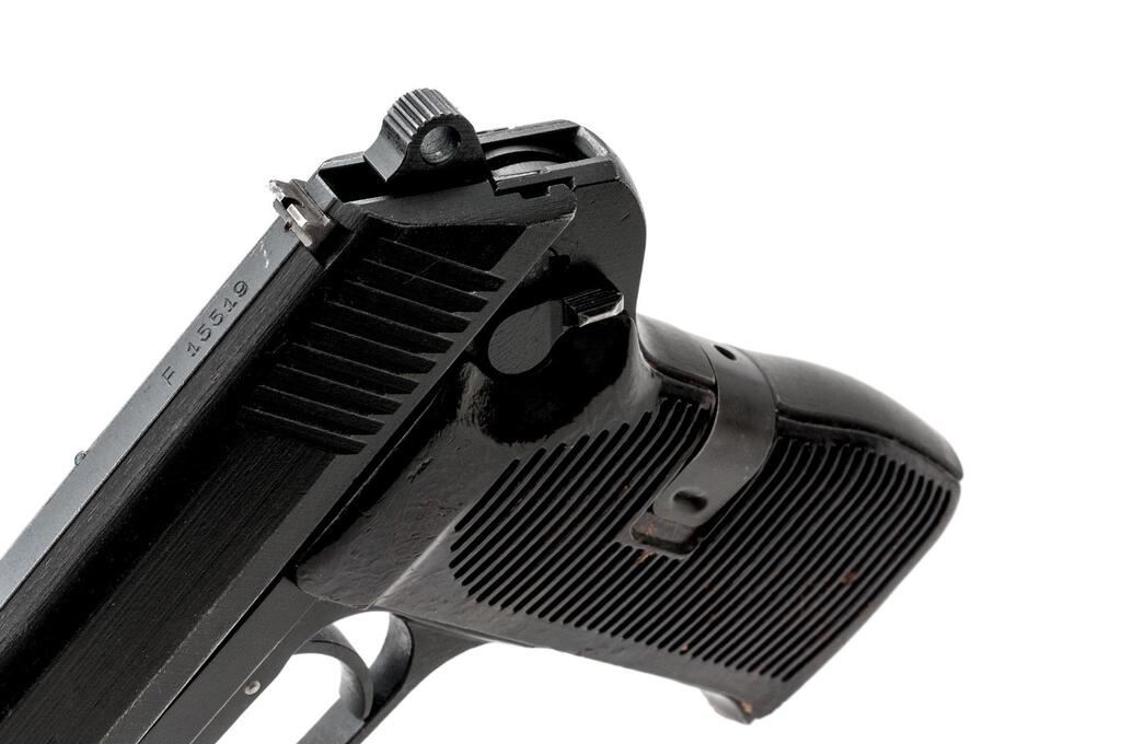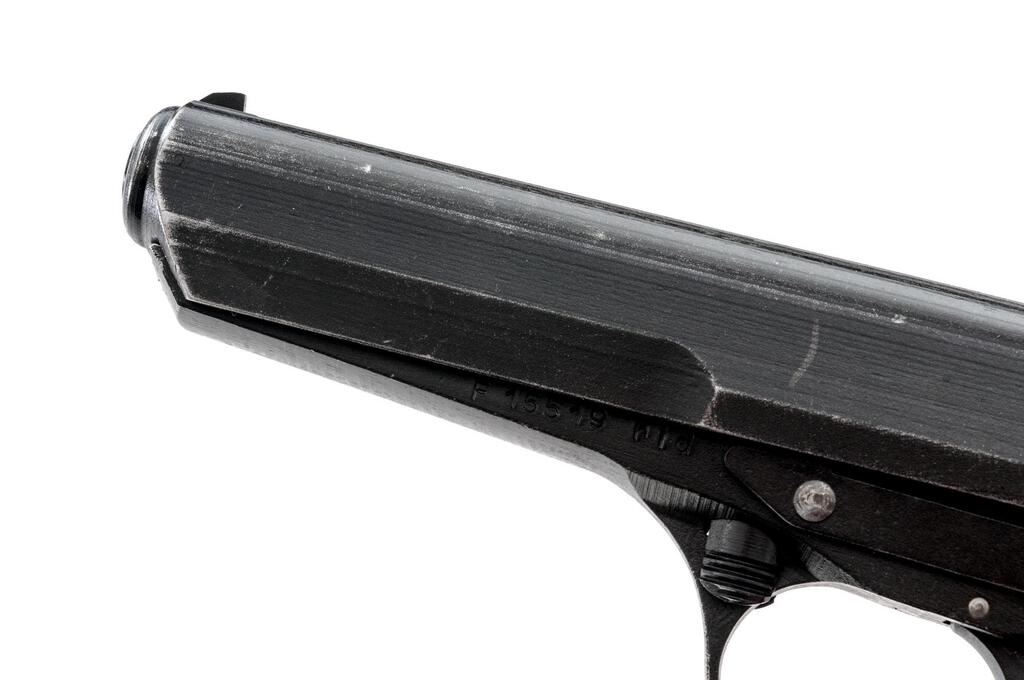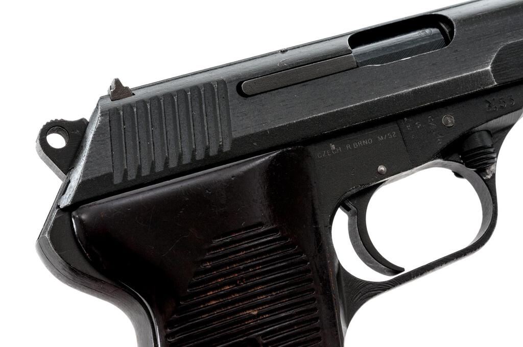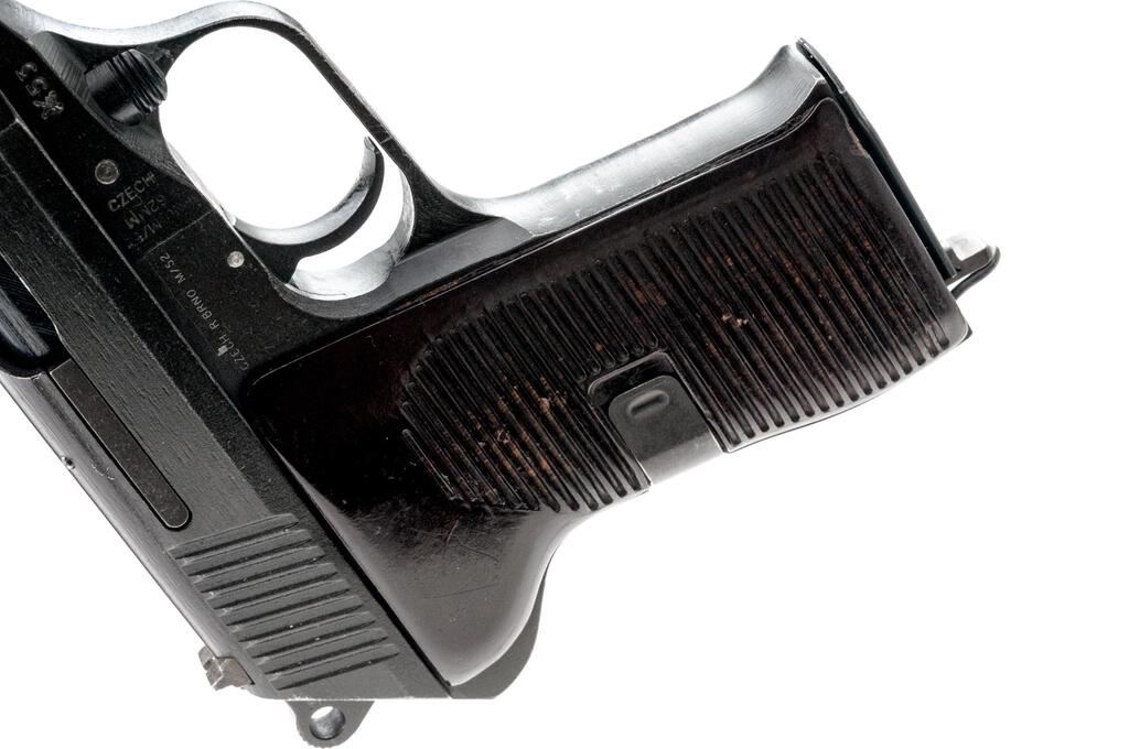 Czech CZ-52 Semi-Automatic Pistol, with Extra Barrels and Firing Pin, #F15519, 7.62x25mm, 4.7" barrel, parkerized finish, brown grooved grips, blade front sight and drift adjustable rear sight with "U" notch. Pistol comes with one excellent condition magazine and an extra firing pin. Extra barrel #1 is blued and has a small proof stamp on top of the chamber. Condition is excellent. Extra barrel #2 has less than 10% finish and is marked with serial #T10266 on the right-side chamber. Bore has darkening in the grooves otherwise good overall. Pistol is marked "rid" on left-side frame and "(Crossed Swords)53" on right-side frame. Matching numbers on slide and frame. Slide has a series of small punch marks on top flat. Condition overall is very good with the metal retaining approx. 85% finish, with high edgewear to both sides of slide. There is a chip to the base of the right-side grip, otherwise both are good, showing small chips to the horizontal grooves and light scratches. Action operates smoothly, bore has areas of old patina and some darkening that may clean better with good rifling. Import stamped on right side frame. Est.: $500-$700. (C&R/PPT)