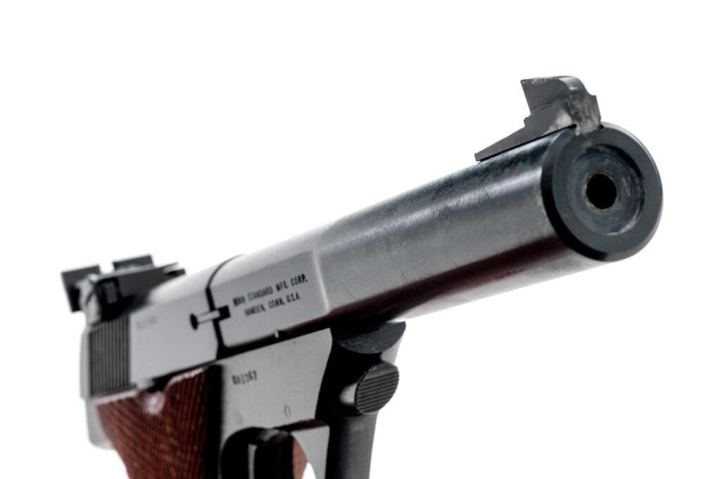 Hi-Standard "The Sharpshooter" Semi-Automatic Pistol, #G01367, .22 LR cal., 5.5" bull barrel, Patridge type blade front and slide-mounted adjustable rear sights, blue finish, push-button takedown, factory ribbed trigger, checkered walnut two-piece target grips with a thumb rest on the left panel, and 10-rd. unmarked magazine. Mfg'd 1975. Pistol is in fine overall condition with some thinning of the finish on the barrel, light wear at the muzzle and around the front sight, light scratches and handling marks. Pistol retains approx. 95% toning factory blue finish. Grips are very good with sharp checkering. Action is crisp, bore is very good with clear defined rifling. Est.: $400-$600. (Modern)(Not available to Calif. residents.)