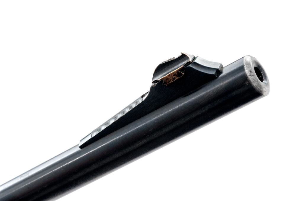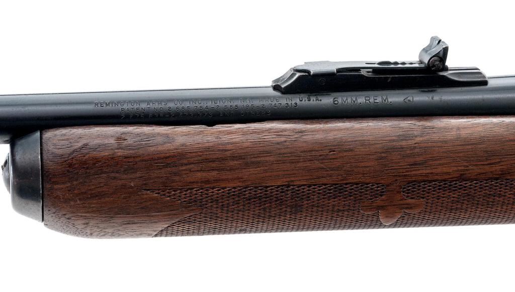 Remington Model 742 Woods Master Semi-Automatic Rifle, #219527, 6mm Rem. cal., 22" barrel, ramped blade in the factory dovetail front and "U"-notched adjustable rear sights, blue finish, checkered wood two-piece pistol grip stock with a checkered aluminum buttplate, 4-rd. detachable box magazine and sling eyes. Mfg'd 1966. Rifle is in very good to near fine overall condition retaining approx. 90% thinning original blue finish, with wear at the muzzle, light scratches and edgewear. A Weaver one-piece base has been added during the period of use. There is some loss of finish on the left side of the receiver, light scratches, and scrapes on the trigger guard. Stock is very good with some flattening of checkering and light marks, ending with a checkered aluminum buttplate providing a 13.25" LOP. Action functions well, bore is good. Est.: $500-$750. (C&R/PPT)