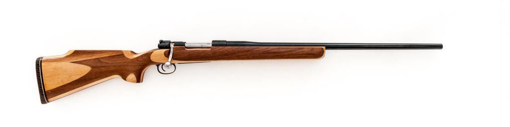 Custom BRNO VZ-24 Bolt Action Sporting Rifle, #D52923, .25-06 cal., 26" medium heavy barrel with no accommodation for sights, flag safety, bolt in the white, blue finish, smooth laminate wood one-piece pistol grip target stock with a Whiteline ventilated rubber recoil pad. Rifle is in fine overall condition with the custom barrel retaining approx. 96%-97% blue finish. Receiver retains a significant amount of blue with a Czech crest on the front ring. Front and rear rings have been drilled and tapped and left vacant. Trigger guard has been slimmed. The smooth laminate wood stock is very good with light scratches and handling marks, ending with a ventilated rubber recoil pad providing a 14.25" LOP. Action works well, bore is very good with clearly defined rifling. Est.: $400-$600. (Modern)