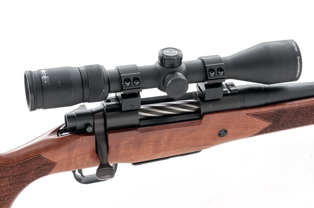 Mossberg Patriot Bolt Action Sporting Rifle, #MPR0090507, .308 Win. cal., 22" fluted barrel with no accommodation for sights, fluted bolt, matte blue finish, stippled walnut one-piece pistol grip stock with cheekpiece and ventilated rubber recoil pad, detachable 5-rd. box magazine, sling studs, Weaver bases and rings, with a Vortex Diamond Back 3-9x40 rifle scope in matte black with a BDC (Bullet Drop Compensator) reticle. Scope has small mars and scratches on the exterior with clear, crisp optics. Rifle is in excellent overall condition showing little use with minor handling and storage marks. Stippled walnut stock is near excellent showing light handling marks with a crossbolt added for stability. Buttstock ends with a Mossberg marked ventilated rubber recoil pad providing a 13.75" LOP. Action functions smoothly, bore is very good with crisp rifling. Est.: $400-$600. (Modern)