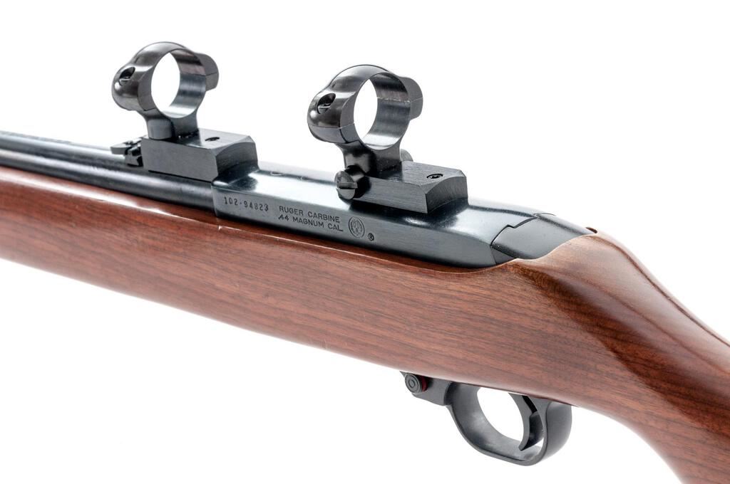 Ruger Model .44 Semi-Automatic Carbine, #102-94823, .44 Magnum cal., 18.5" barrel, banded blade with brass bead front and folding rear sights, blue finish, smooth walnut stock with barrel band, sling swivels, and ending with a smooth plastic crescent buttplate providing a 13.25" LOP. Mfg'd 1981. Rifle is in near excellent overall condition retaining approx. 93%-95% factory blue finish, with light scratches and handling marks. Redfield two-piece bases and rings added. Walnut stock is near excellent showing little use. Action functions well, bore is very good with defined rifling. Long out of production, these handy rifles were mfg'd from 1961 to 1985 before they were discontinued due to their high production cost. Est.: $1,000-$1,400. (Modern/PPT)