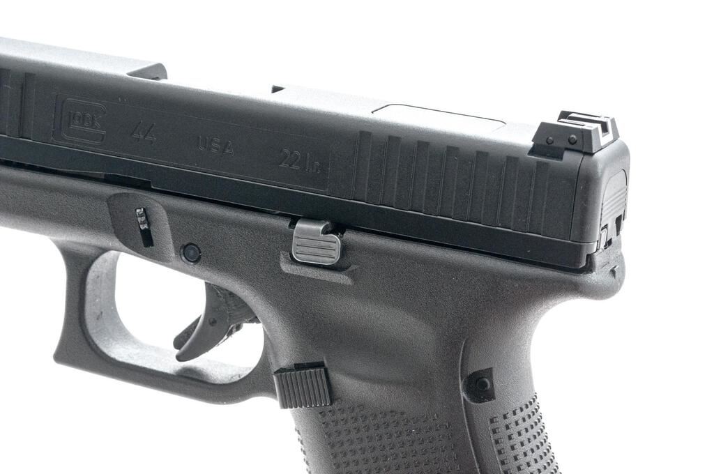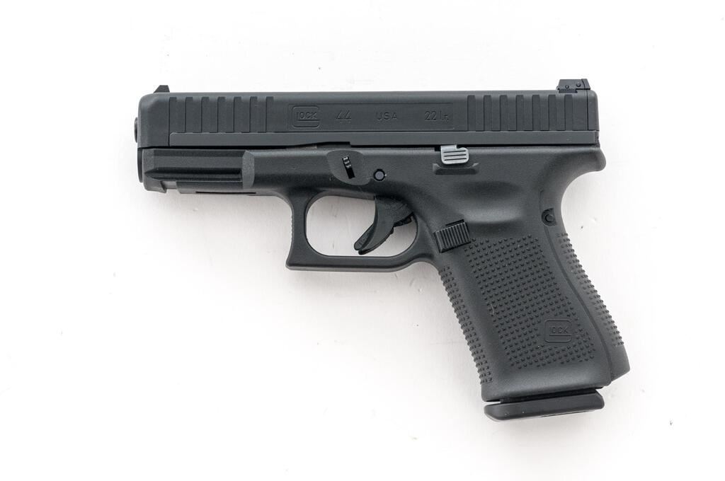 Like New Glock Model 44 Gen 5 Semi-Automatic Pistol, #ADPU062, .22 LR cal., 4" barrel, lightweight polymer covered steel slide, black polymer frame with integral lower accessory rail, white dot front sight and square-notched white outline rear sight, with three (3) 10-rd. Glock magazines. In matching numbered Glock case with sealed instruction manual and four (4) additional interchangeable back straps. Pistol is in like new condition, appearing to have been handled and fired very little. Bore is mirror bright. Est.: $300-$400. (Modern) (Not available to Calif. residents.)