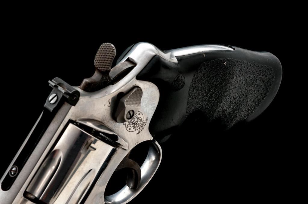 Smith & Wesson Model 629-6 Double Action Revolver, #CNS0941, .44 Magnum cal., 4" barrel, red insert ramped blade front and adjustable rear sights, 6-shot cylinder, brushed stainless steel finish, S&W textured rubber one-piece combat grips. Includes the factory blue plastic case with a matching end label. Revolver is in very good overall condition with light scratches and mars from carry and use. There is light surface rust around the base of the front sight and some dried oil that should clean. Hammer and trigger show muted color case hardening. Grips are very good and show little use. Action locks up tight, bore is very good with crisp rifling. Est.: $700-$900. (Modern/PPT)