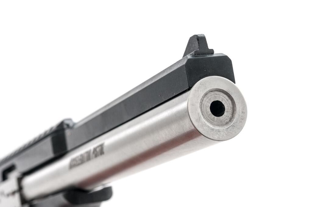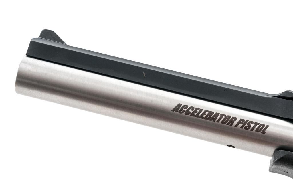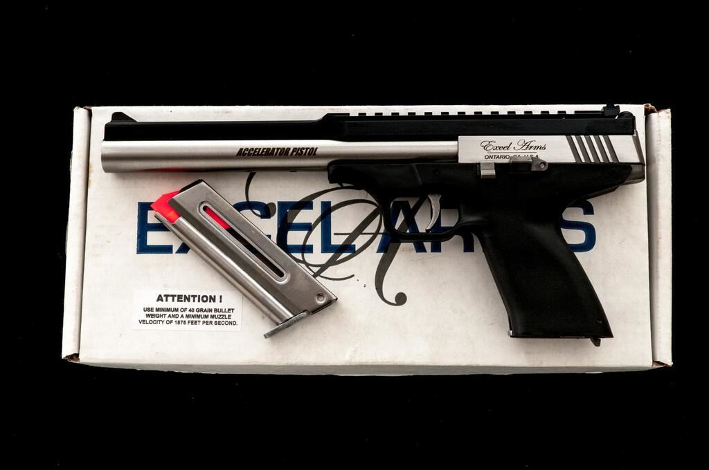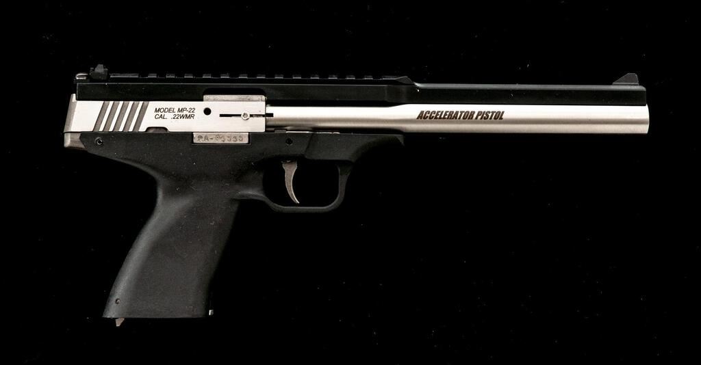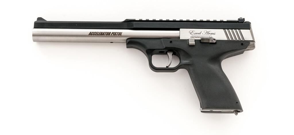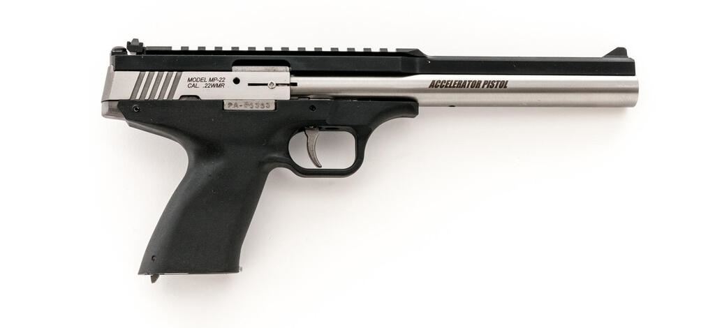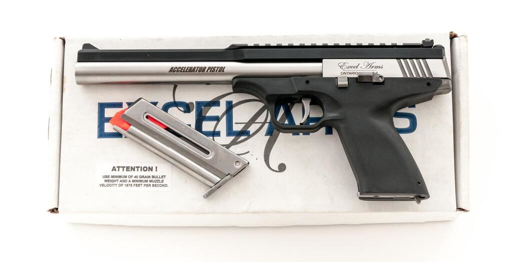 Excel Arms MP-22 Accelerator Semi-Automatic Pistol, #PA-05353, .22 WMR cal., 8.5" bull barrel, blade front and adjustable rear sights, integral Weaver style base, stainless steel construction, stainless steel finish, smooth one-piece black polymer grips with integral trigger guard. Includes the original factory cardboard box with matching end label, two 9-shot magazines, lube, cable lock, manual, warranty card, wrench and associated packaging materials. Slide is marked "Excel Arms/ONTARIO, CA, U.S.A." at left rear. Pistol is in excellent overall condition showing little use with only minor handling and storage marks. Grips are near excellent as well. Production began in 2008 on these unique blowback action pistols. Est.: $400-$600. (Modern/PPT)