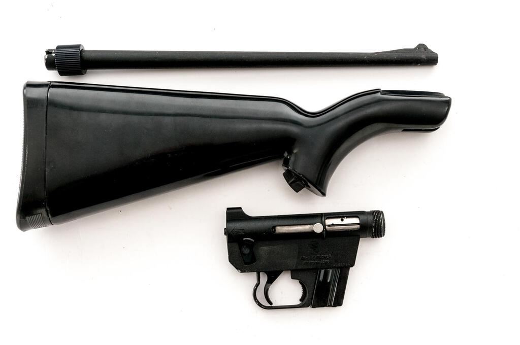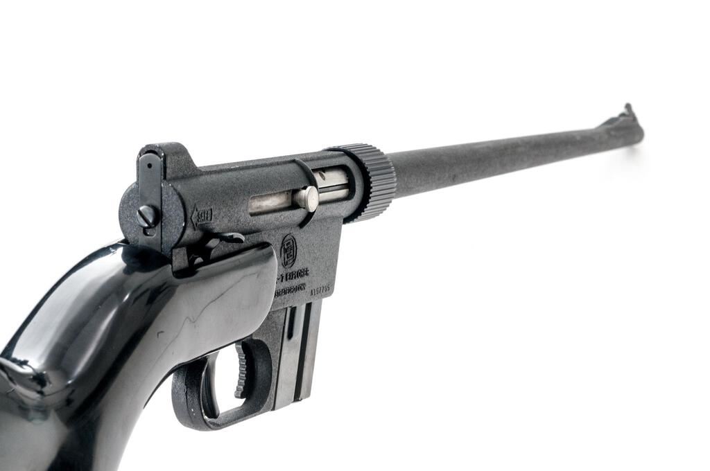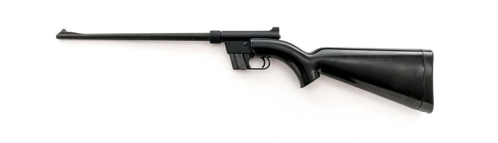 Charter Arms AR-7 Explorer Semi-Automatic Takedown Rifle, #A157755, .22 LR cal., 16" barrel, ramped blade front and receiver mounted peep sights, black finish, Cycolac synthetic stock, one 8-rd. detachable magazine, and original factory cardboard box with matching end label. Rifle is in very good overall condition retaining a significant amount of matted black finish, with wear at the muzzle, scratches, and small mars from carry and use. The synthetic stock is good with light scratches and handling marks only. Action functions smoothly, bore is good with defined rifling. Est.: $200-$300. (Modern)