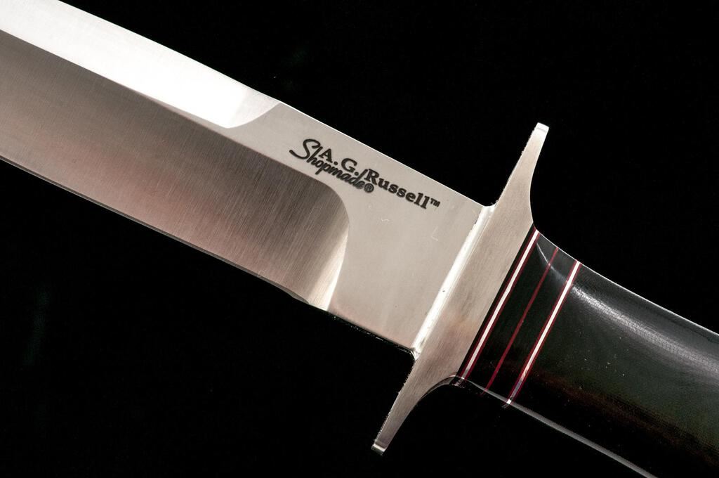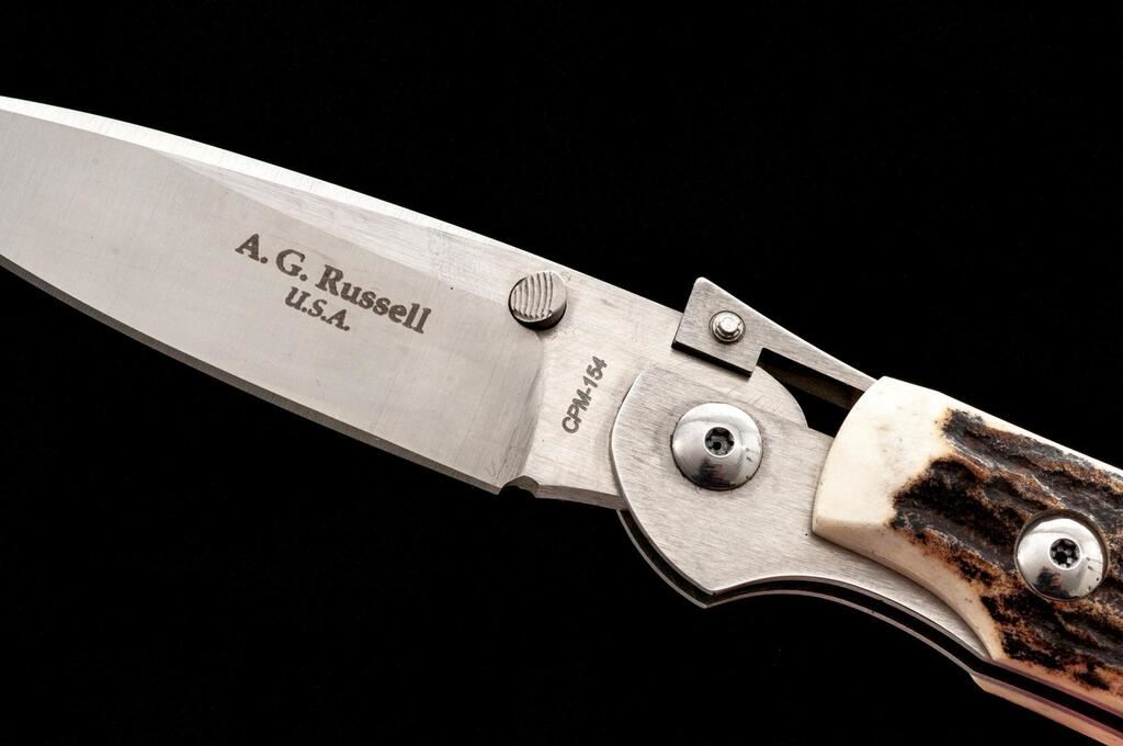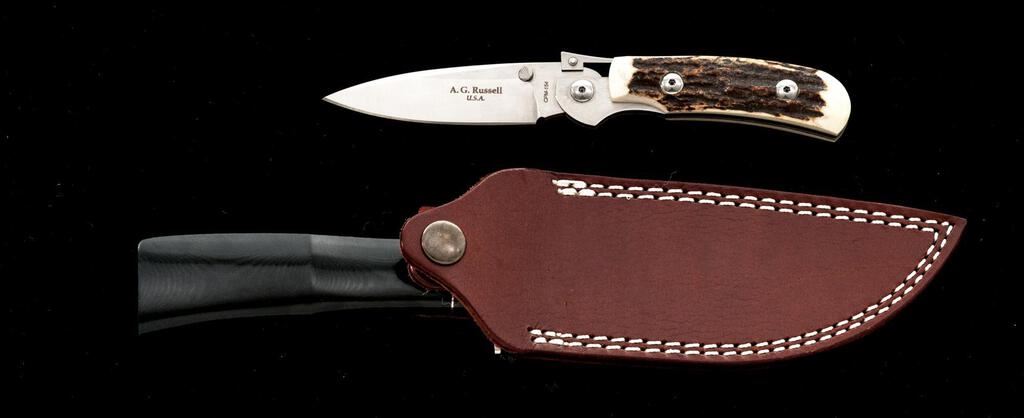 Lot of Two (2) Knives, by A.G. Russell: 1.) Shop-made Fixed Blade Knife, 4-7/8" satin-finished blade, 9-1/2" overall, double stainless hilt, black micarta handle with red spacers, and brown leather sheath. Knife and sheath are in excellent condition. There is a small line of mild surface rust on one side, where the blade meets the hilt, otherwise appearing like new. 2.) One Handed Folding Knife, 3-1/4" satin-finished drop-point blade, 4" OAC, stag handles. Knife is in excellent, as new condition, with only a few very minor handling marks. Est.: $300-$400/Lot.