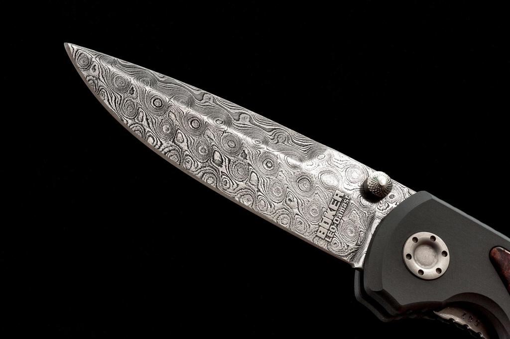 Boker Helios Leo-Damast Linerlock Folding Knife, #682 marked on the liner, 3-3/8" Leo-Damascus pattern blade by Markus Balbach, 4-3/4" OAC, gray aluminum handle with desert ironwood inlays, and pocket clip. Includes the original display box and paperwork. Knife is excellent, appearing as new. Wood box shows a few minor storage type marks. Est.: $250-$400.