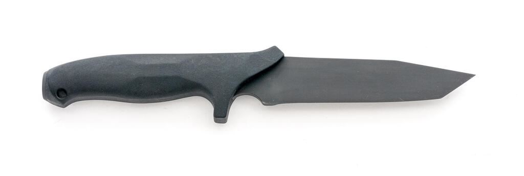 Timberline Knives Emerson/Neeley Specwar Fixed Blade Knife, 5-1/2" black tanto blade, 12" overall, black fiberglass reinforced nylon handle, with black Kydex sheath. Knife is in excellent condition. There are a few very minor sheath marks on the blade. Outside of sheath shows a little mild storage type wear. Est.: $250-$350.