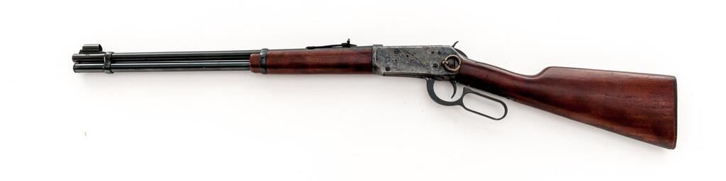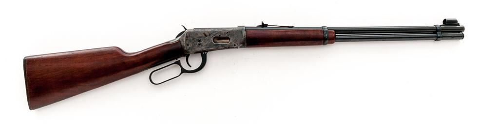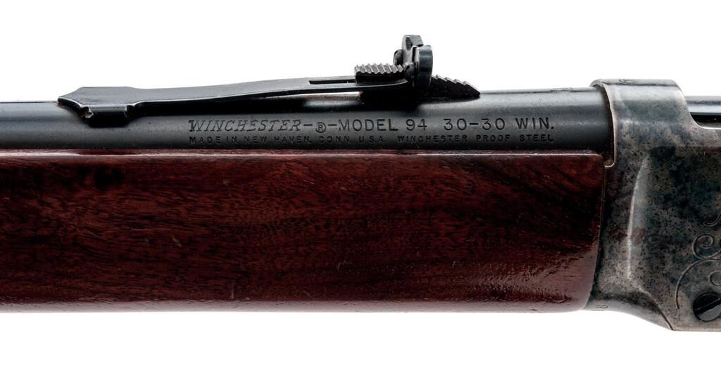 Winchester Model 94 Lever Action Saddle-Ring Carbine, #4189918, .30-30 Win. cal., 20" round barrel with a full-length magazine, hooded ramped blade front and semi-buckhorn rear sights, blued barrel and magazine with case-colored receiver, smooth walnut two-piece straight grip stock with a checkered plastic Winchester marked shotgun buttplate. Mfg'd 1975. Carbine is in fine overall condition retaining approx. 90%-92% factory finish on the barrel and magazine. There is light surface rust at the muzzle and around the front sight. Receiver shows muted case coloring with light scroll engraving and the saddle ring retained. Markings are crisp with Winchester "WP" proofs on the front ring and barrel. Smooth walnut stock is very good with several small mars and compressions. There is a larger mark on the left side below the tang at the wrist. Action is crisp, bore is very good. Est.: $600-$800. (Modern)