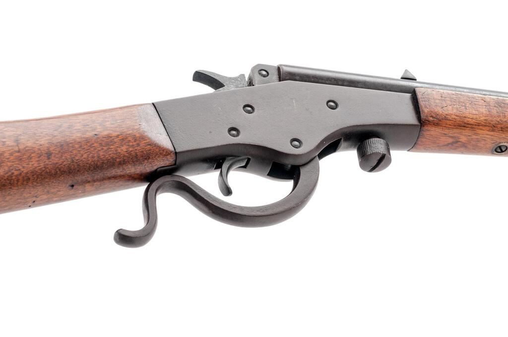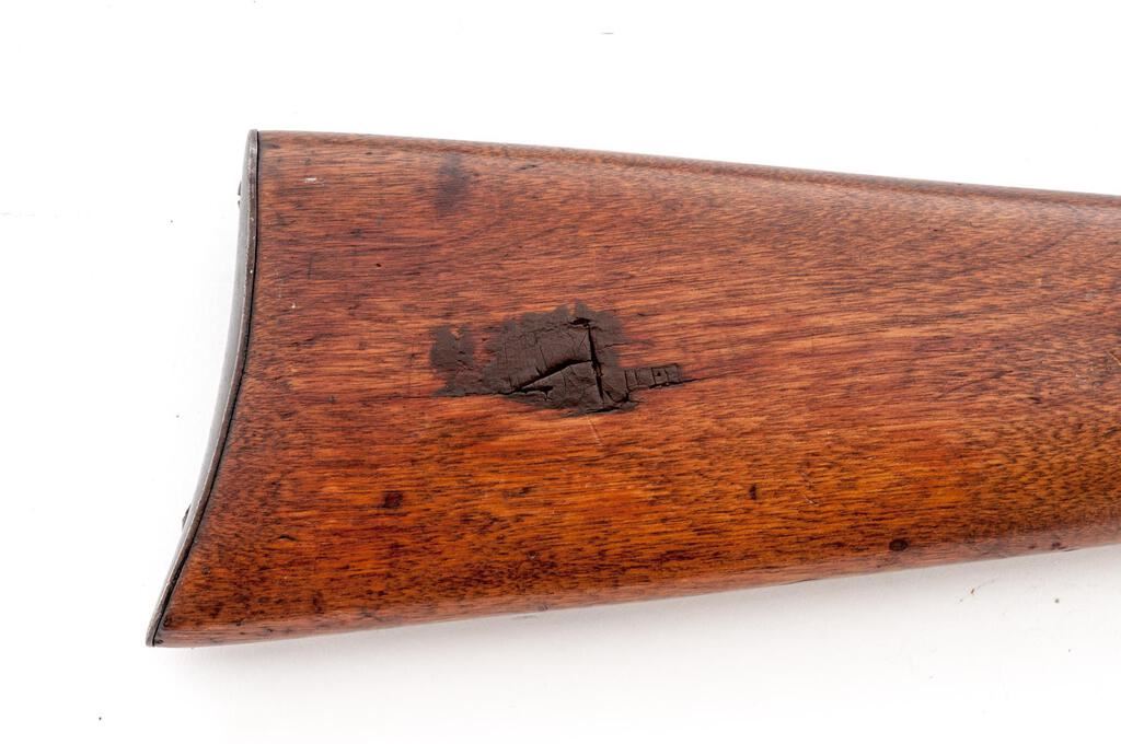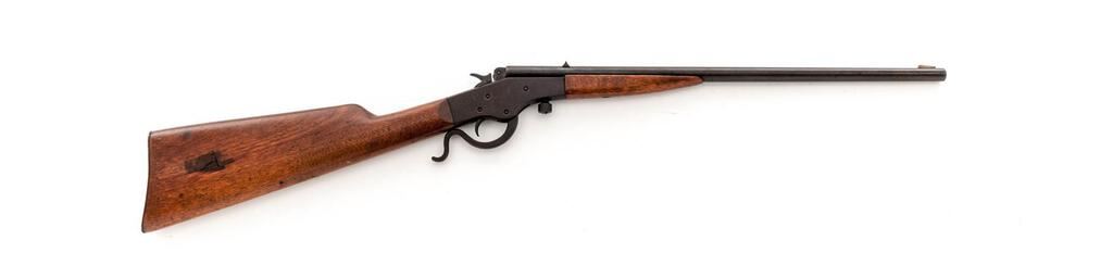 J. Stevens Crack Shot-26 Single Shot Falling Block Takedown Rifle, NSNV, .32 Long RF cal., 18" round barrel, German silver knife blade front and "V"-notched fixed rear sights, blue finish, thumb-screw takedown, smooth wood two-piece straight grip stock. Mfg'd from 1913-1939. Rifle is in good overall condition with the metal surfaces having gone to a dark brown patina, showing roughness at the muzzle and areas of light surface erosion evident along the barrel. Stock is in good condition with dents and mars consistent with field use. There is a small chip at the left rear of the hand guard, and there is a crude repair on the right side of the buttstock. Action locks up tight, bore is fair with some roughness and light pitting. Est.: $200-$400. (C&R)