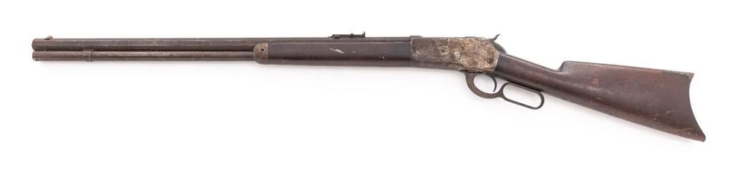 Winchester Model 1886 Lever Action Rifle, #45587, .45-70 CF cal., 26" octagonal barrel, standard sights, marked with maker's name and address at top flat, caliber at breech; receiver marked "?Model 1886?" at top tang, 1884-85 patent dates and serial number lower. Oil-finished walnut stocks have steel nosecap and crescent buttplate. Mfg'd 1890. Condition is fair. A victim of poor storage, rifle retains perhaps 15% original blue under peppering and light erosion; receiver has silvered with corresponding oxidation and erosion. Edges and markings are good. Stocks are sound and smooth with light marks, neatly stamped "W. Koker" at each side of forearm/buttstock. Action is sticky, bore shows overall erosion, fair rifling. Missing nosecap screw. Will benefit greatly from a sympathetic cleaning. Est.: $1,000-$1,200. (Antique)