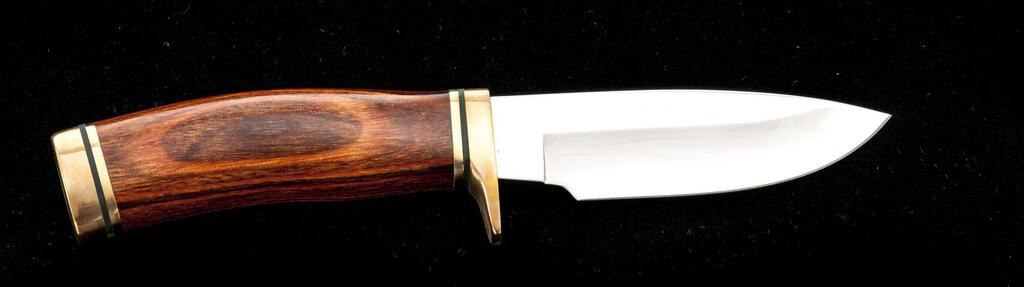 Scarce Limited Edition 1994 Buck Collectors Club Model 192 Vanguard Fixed Blade Knife, 4-1/8" mirror-polished drop-point blade with gold etched Buck Collectors logo, numbered 15/160. Brass single hilt and pommel with laminated wood handle. In clamshell case with COA. In excellent condition, with slight scratches and handling marks to the mirror polished blade. Est.: $150-$250.