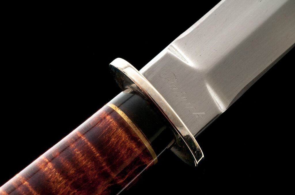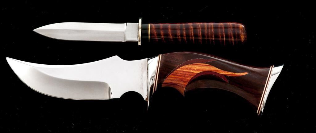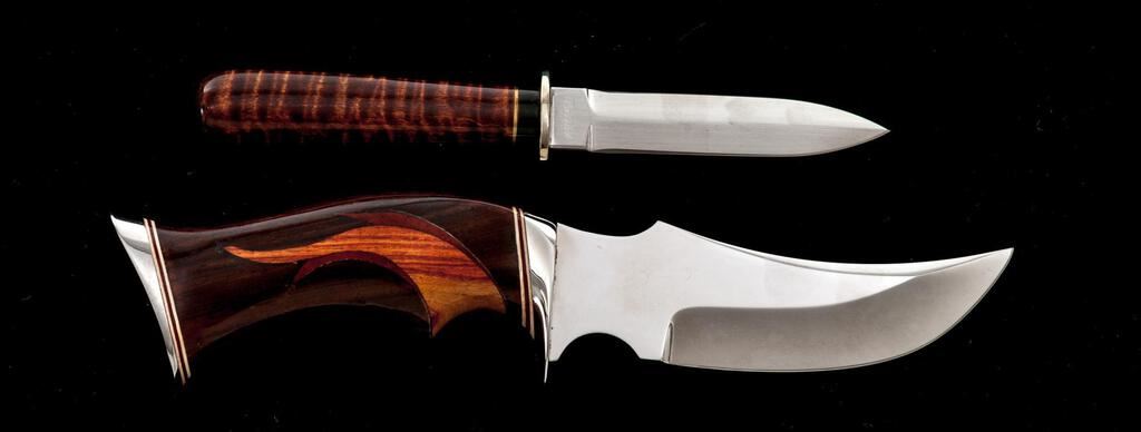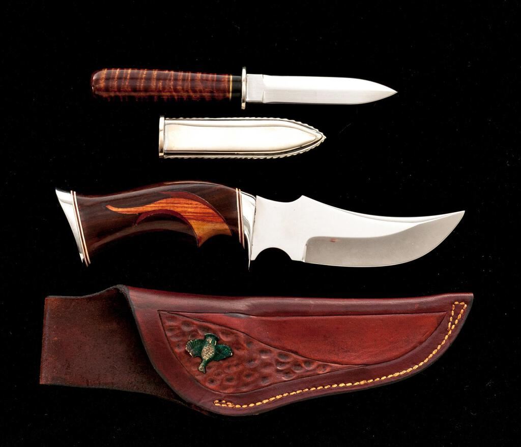 Lot of Two (2) Custom Fixed Blade Knives, by Patrick Donovan and William Herndon: 1.) Dagger, by Patrick Donovan, 3-3/4" double edged blade, 7-5/8" overall, nickel silver hilt, wood handle, with silver-plated sheath. Knife is excellent, unused. Handle has a few shallow impressions. There are some minor handling marks to the outside of the sheath. 2.) Trailing Point Knife, by William Herndon, 5" mirror polished blade, 9-1/2" overall, mirror polished single hilt, wood handle with finger groove and contrasting decorative wood inlay. Includes brown leather sheath with brass quail medallion. Knife and sheath are in near excellent condition. There is mild surface rust along the protected area where the blade meets the hilt. Otherwise, appearing as new. Est.: $500-$700/Lot.