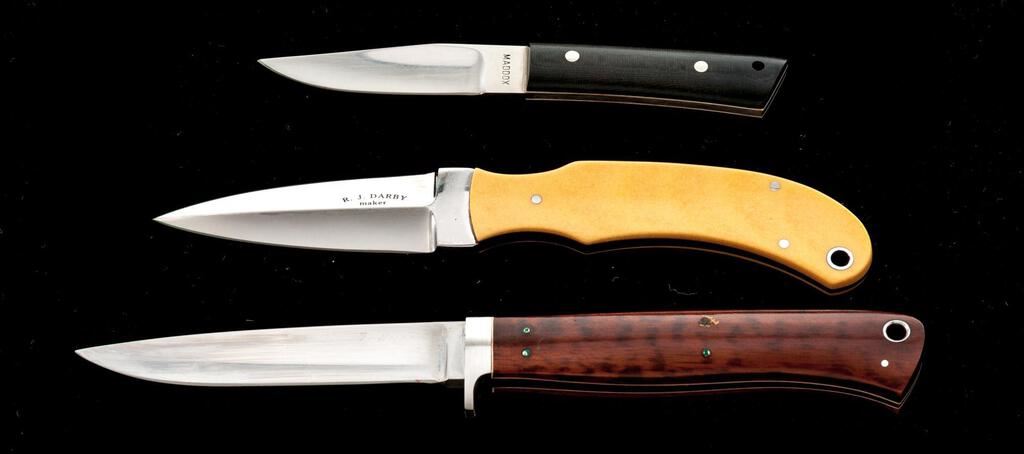 Lot of Three (3) Custom Fixed Blade Knives, by R.J. Darby, F. Norton, and Mickey Maddox: 1.) Dagger by Rick Darby, 3" double edged blade, 6-7/8" overall, yellow micarta scales, with original brown leather Rick Darby sheath. Knife is in excellent as new condition. Sheath with a few light scuffs and scratches. 2.) Fixed blade knife by F. Norton, 3-3/4" drop-point blade, 7-7/8" overall, wood scales with white liners. Includes original "FN" marked tan leather sheath. Blade is like new. Finish has flaked around one of the scale pins. Sheath is excellent. 3.) Small fixed blade knife, by Mickey Maddox, 2-3/4" blade, black micarta scales with black leather sheath. Condition is excellent, appearing as new, with only a few very minor handling marks. Est.: $350-$550/Lot.
