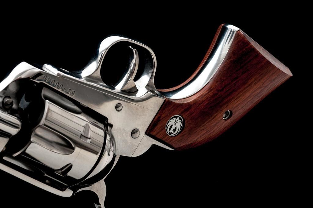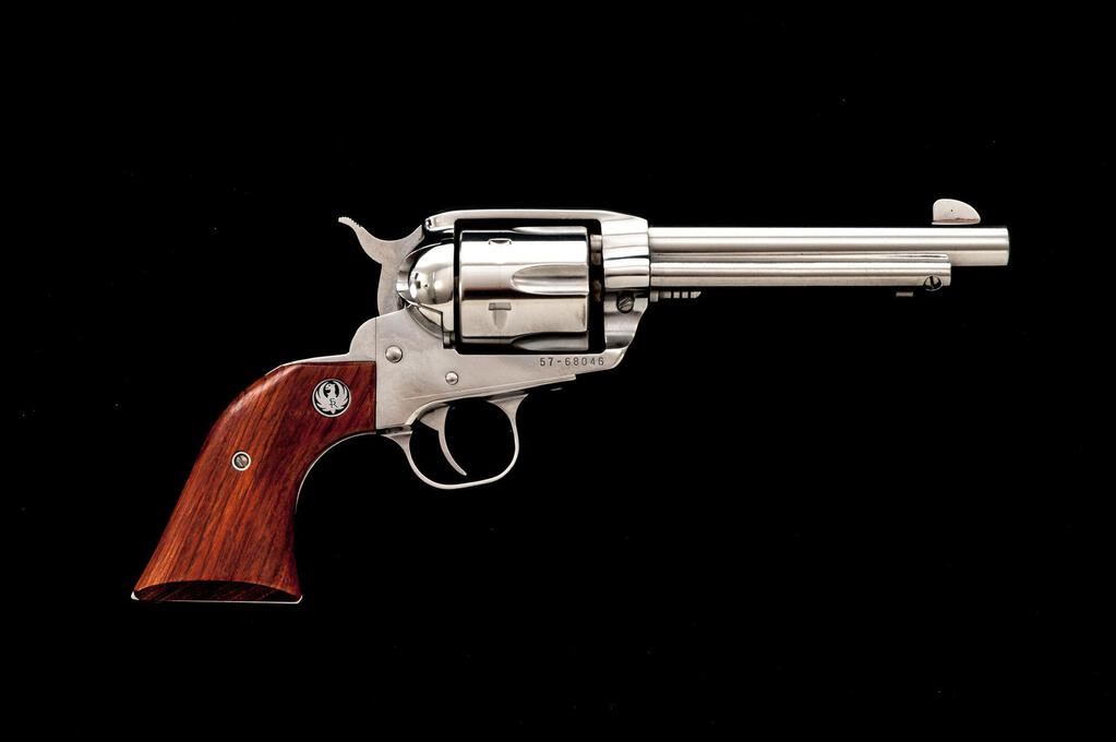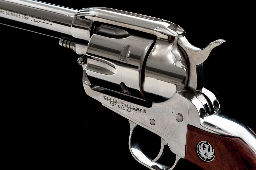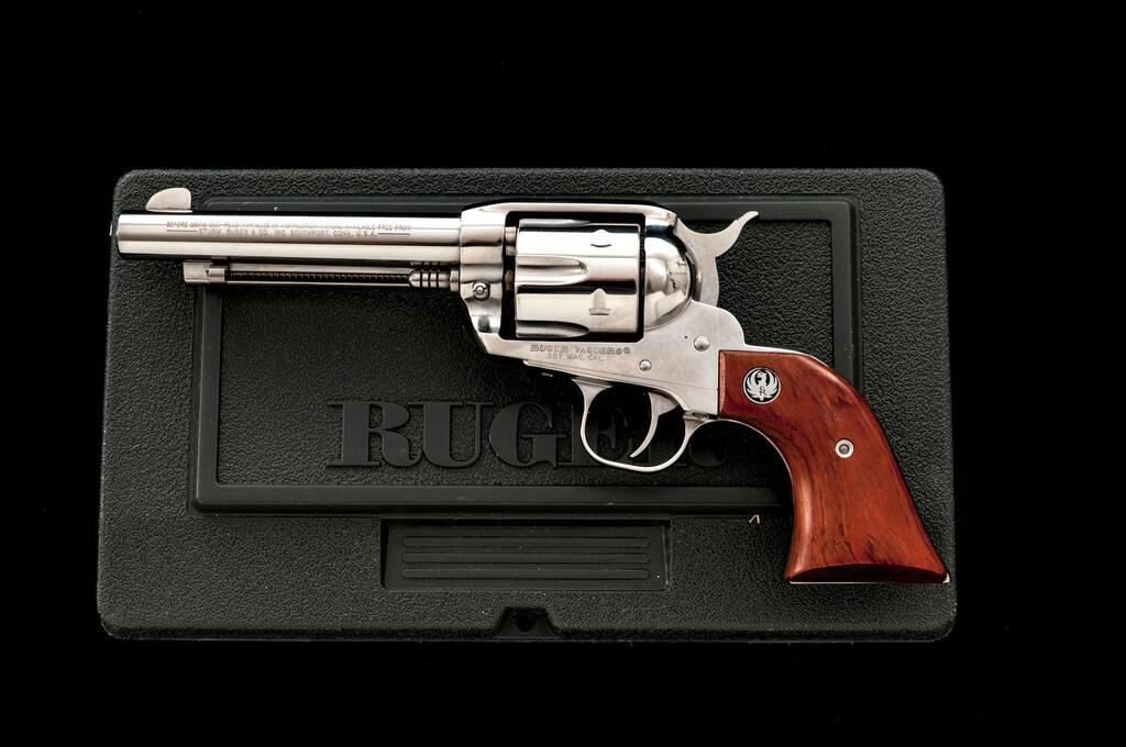 Ruger Vaquero Single Action Revolver, #57-68046, .357 mag. cal., 5.5'' barrel, high-gloss stainless finish, smooth hardwood grips with Ruger silver eagle medallions, and standard fixed sights. In original gray plastic case with matching numbered end label and gun lock. Condition is near excellent. Metal surfaces with light scratching and small handling marks, typical of high-gloss stainless finishes. Factory lettering is crisp. Grips show only minor use. Cylinder with a light index line; chambers are clean, cylinder face with normal powder burn marks. Crisp tight action, bright bore with excellent rifling. Est.: $700-$900. (Modern/Exempt)