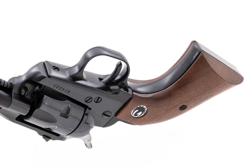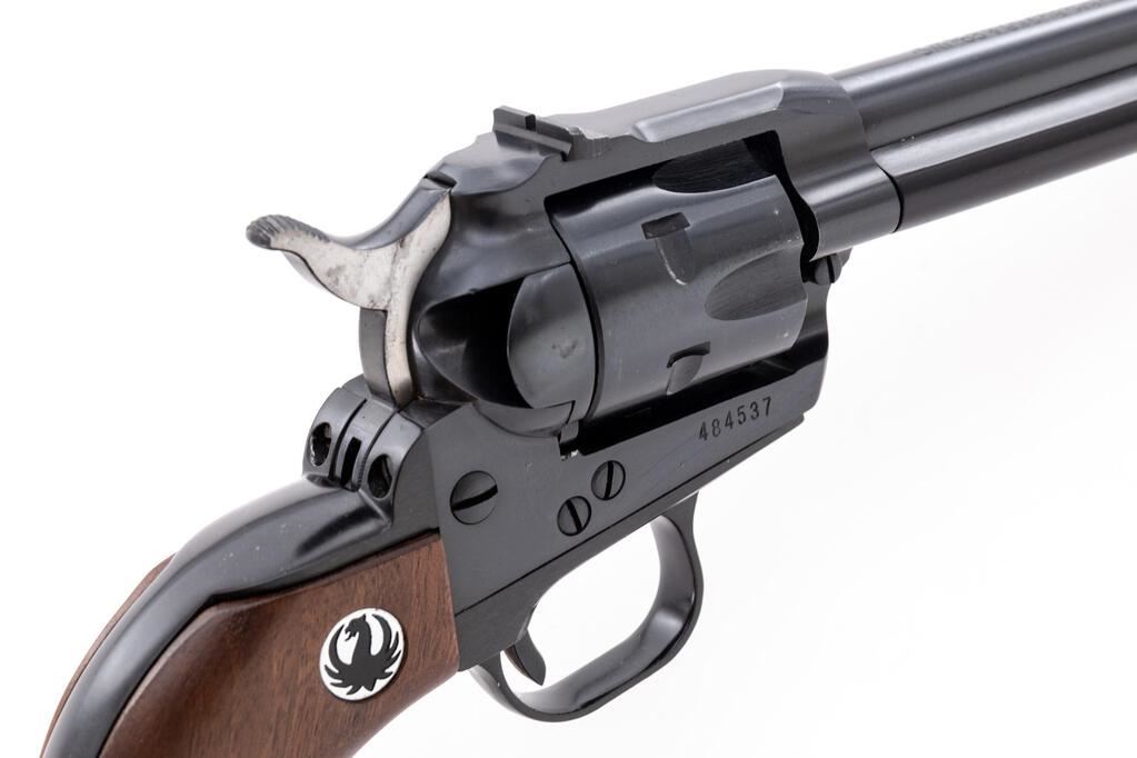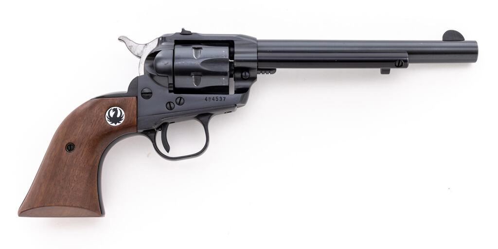 Ruger Single-Six Convertible Single Action Revolver, #484537, .22 WMR cal., 6.5" barrel, blade front and square-notched drift adjustable rear sights, blue finish, smooth walnut Ruger two-piece medallion grips, with extra .22 LR cylinder. In factory cardboard box with matching end label, warranty card, and manual. Mfg'd 1967. Revolver is in near excellent overall condition showing little use, retaining approx. 97%-98% factory blue finish, with light wear at the muzzle and a faint index line on the cylinder. Smooth walnut medallion grips are about excellent. Bore is very good and action is crisp on this desirable pre-transfer bar gun with a three-screw frame and extra cylinder. Est.: $400-$600. (C&R/PPT)