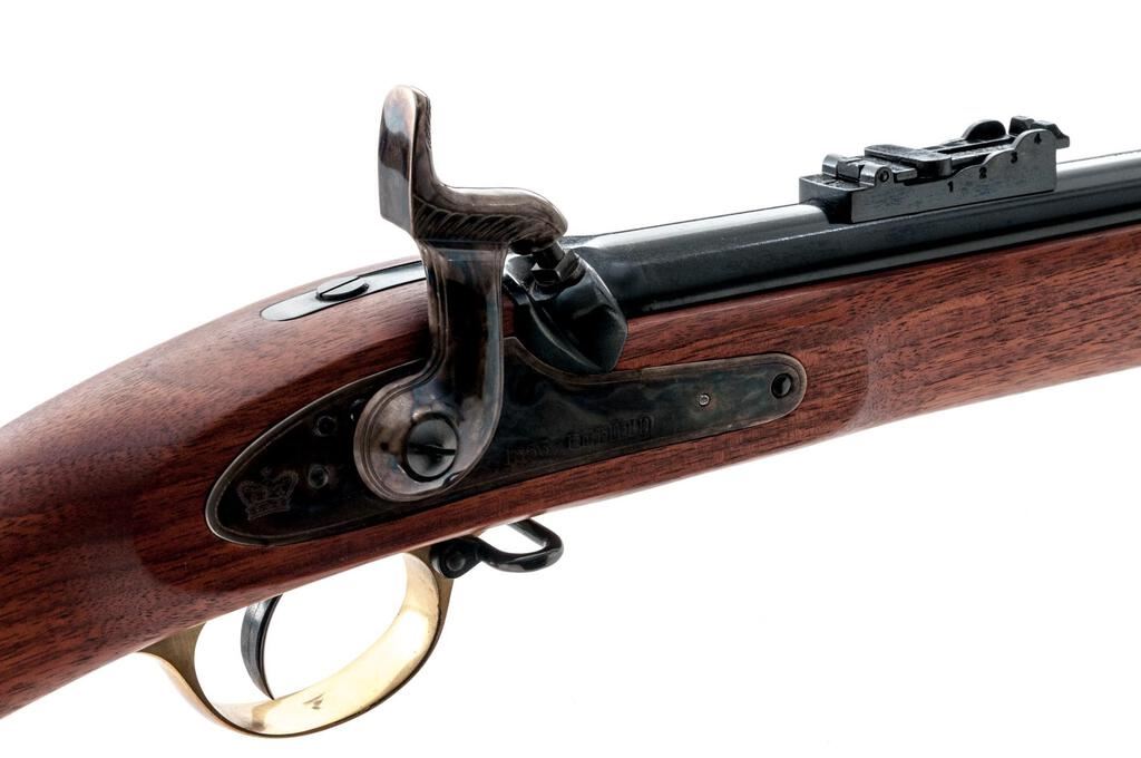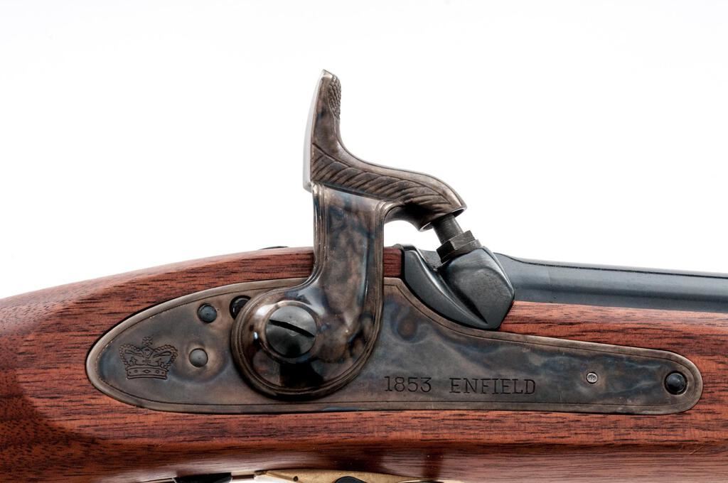 Reproduction British Tower Enfield P-1853 Percussion Rifle-Musket, by Armi-Sport, Italy, #12106, .58 cal., 39" round barrel, block-blade front and folding-leaf rear sights, marked with maker's info/black powder warning/caliber at top, proofs and serial number at breech; flat lockplate is marked "1853 Enfield" ahead of engraved hammer, "(crown)" behind; brass trigger guard with sling swivel, buttplate, 2 "winged" lock bolt escutcheons, nosecap; 3 steel clamping bands (top with sling swivel) retain the slotted/grooved ramrod. Oil-finished walnut fullstock. Condition is as new retaining all deep black-blue to barrel, vivid case colors to lock, hammer and bands, and bright brass. Stock with smooth finish is unmarked. Action is crisp, unfired bore shows full blue, sharp rifling. Est.: $700-$900. (No FFL Required)