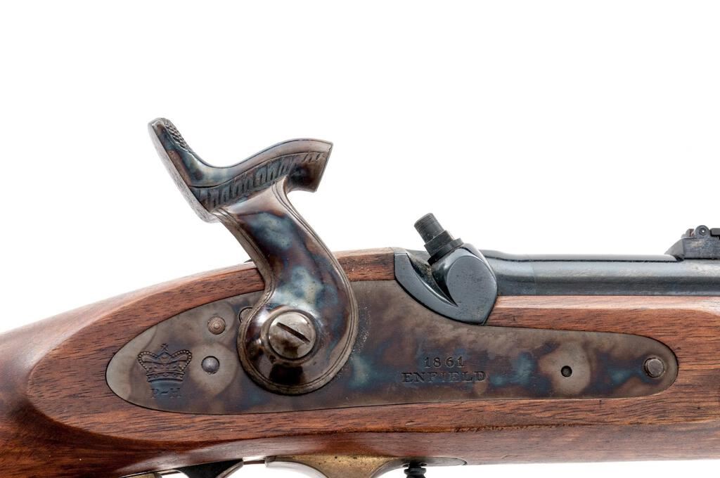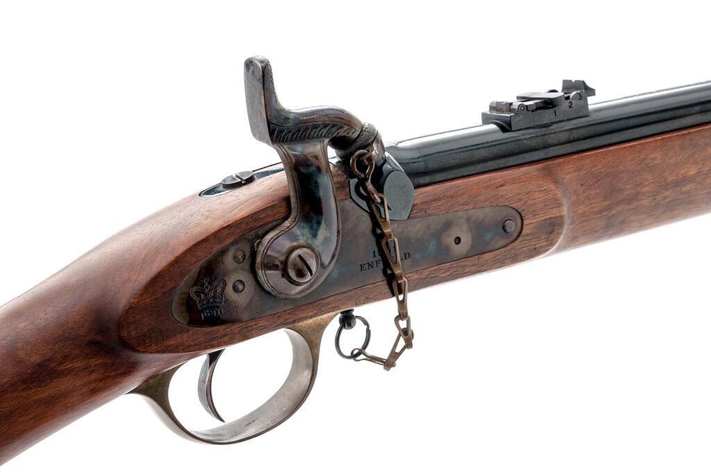 Reproduction British Tower Enfield P-1861 Percussion Musketoon, by Parker-Hale, Birmingham, #1929, .58 cal., 24" round barrel with carbine sights and bayonet lug 4" below muzzle, marked with maker's name and address at top and "(crown)/BP" at breech; flat lockplate marked "1861/Enfield" ahead of engraved military hammer and "(crown)/P-H" behind; brass trigger guard with chain-retained nipple protector, buttplate, 2 "winged" lock bolt escutcheons, nosecap; 2 steel clamping bands (front with sling swivel) retain the slotted/grooved ramrod. Oil-finished walnut 3/4" stock has a .75" roundel at right marked "Parker-Hale/Ltd.", sling swivel at belly. Condition is near new retaining approx. 98% deep black-blue to barrel and bands, vivid case colors to lock/hammer (light rubbing where chain rests), toned brass. Stock with smooth finish is unmarked. Action is crisp, unfired bore shows full blue, light rifling. Est.: $450-$650. (No FFL Required)