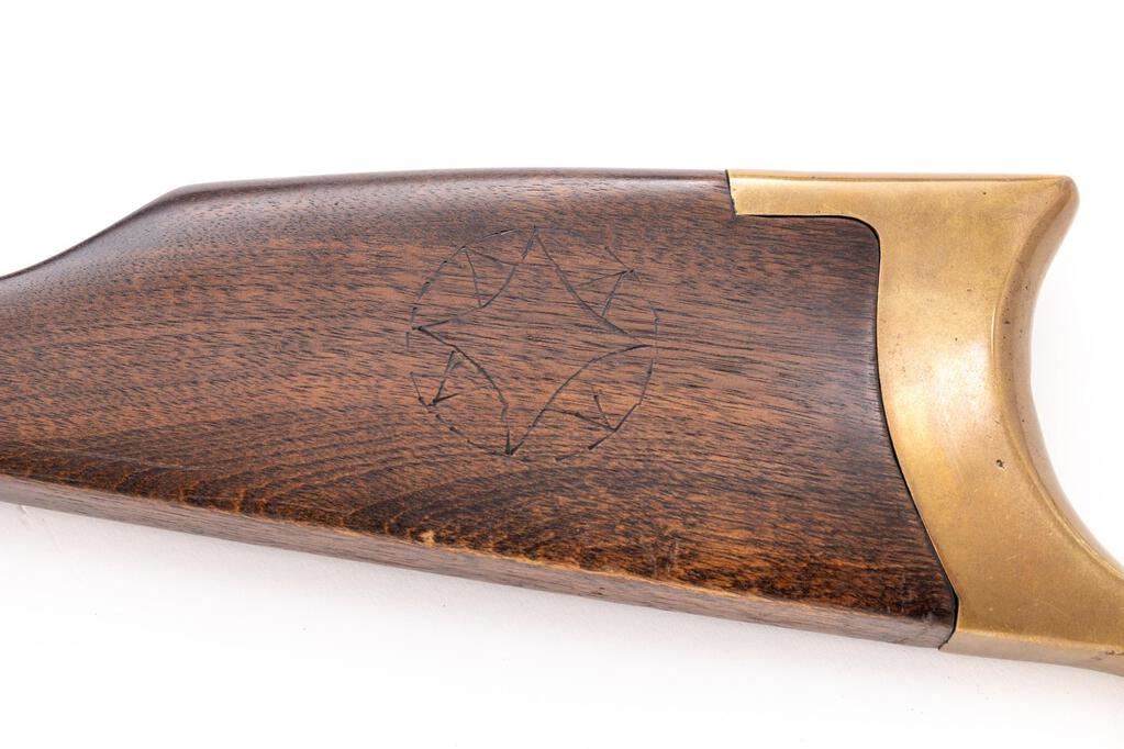 Reproduction Brass Frame Percussion Sporting Rifle in the Allen & Thurber Style, #6351, .45 cal., heavy 32" octagonal barrel (measures 1" across flats) with blade front/notched rear sights, marked "45" and "Mowrey/Olney, Texas" at right breech; brass frame has integral nipple bolster with cleanout screw, heavy Swiss-style buttplate, 9" brass forend, 2 pipes retaining the brass-tipped hickory ramrod. Mfg'd ca. 1970s. Condition is near excellent retaining approx. 98% blue, showing light field use and smooth toned brass. Stock with 2" encircled 8-pointed star at left. Action is crisp, bore is bright with sharp rifling. Est.: $300-$500. (No FFL Required)