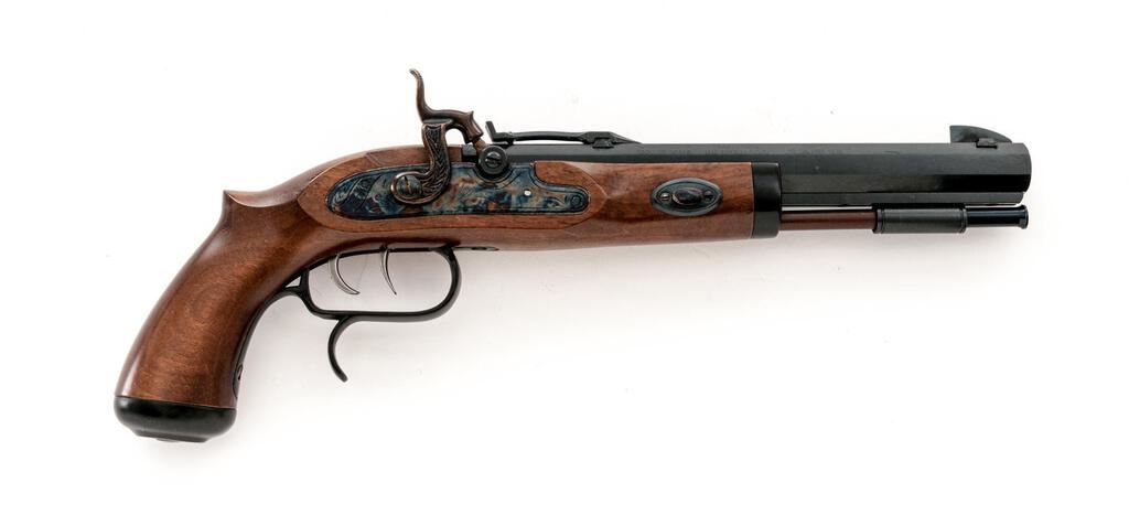 Reproduction Saw-Handle "Trapper" Percussion Target Pistol, by Traditions, #14-13-048685-95, .50 cal., 10" heavy octagonal barrel marked with maker's info, etc., at left, B.P warning at right, has tall blade front and adjustable notched rear sights, under-rib with single ferrule retaining the ramrod; engraved flat lockplate with matching hammer has drum nipple bolster. Smooth walnut halfstock has scrolled trigger guard, double set triggers, oval buttcap, flat nosecap. Condition is new and unfired retaining 100% original finishes, sharp edges and markings. Stock is sound and smooth with lovely satin finish. Action is crisp, triggers work as designed, bore shows full blue and sharp rifling. Fitted Styrofoam box insert in good condition is included. Est.: $200-$300. (No FFL Required)