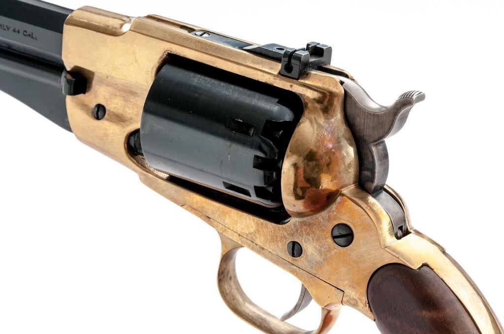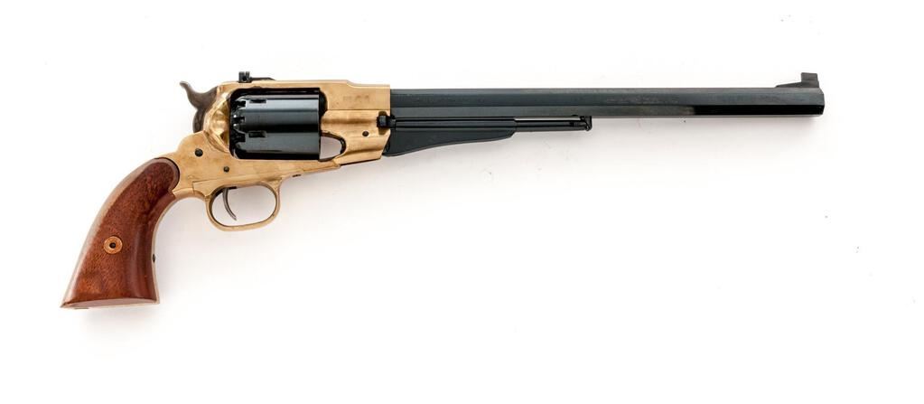 Reproduction Remington Model 1861 Army "Buntline" Percussion Revolver, by Pietta, with Color Pictorial Carton, #R296245, .44 cal., 12" octagonal barrel has maker's name, address, and proofs at right, "Black Powder Only 44 Cal." at left, tall front sight, hinged lever below; plain round 6-shot cylinder; brass solid frame has adjustable rear sight, proofs at right, matching trigger guard, integral straps with 2-pc. oil-finished walnut grips. Condition is new and unfired retaining all its deep black-blue to barrel, lever, and cylinder lightly-toned bright brass. Stocks show light handling, finish loss at backstrap. Action is crisp, bore shows full blue, sharp rifling. Matching-numbered box shows light wear, bright color graphics. Est.: $300-$500. (No FFL Required)