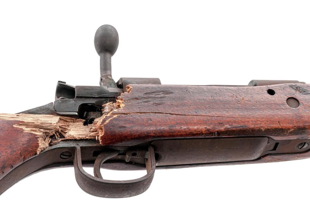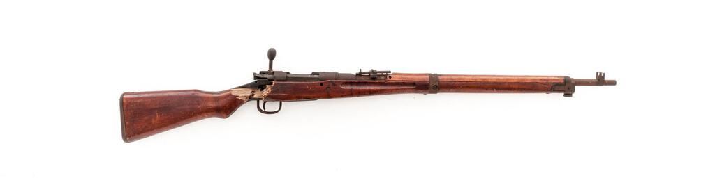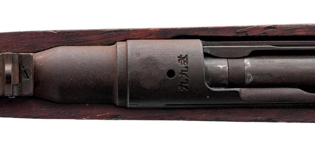 Battle Damaged Japanese Type 99 Arisaka Bolt Action Rifle, #2145, 7.7x58mm, 25.5" barrel, blued finish, two-piece hardwood stock, inverted "V" front sight with protectors and adjustable folding leaf rear sight with aperture. Marked on top of receiver ring with ground-off mum crest over characters for "99 Type". Left-side receiver rail stamped with Fourth Series mark and the two symbols for the Izawa Jyuko Arsenal. Matching number on bayonet lug. #415 stamped on underside of bolt handle. Rifle appears to have been shot with a bullet removing the cocking piece and bending the bolt body with the bolt now jammed inside the receiver. Additional bullets struck the right side of the stock wrist removing approx. a 3"x2" section of wood. Condition overall is poor with most of the metal frosted with a rust patina. Stock is cracked forward of the damaged area and shows other handling marks and darkening to the finish. Muzzle inspection shows a good bore with good shallow rifling. Action cannot be operated. Est.: $300-$500. (C&R)