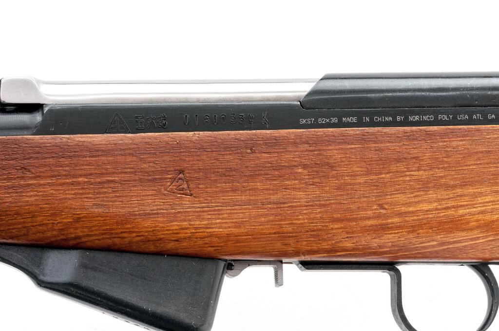 Chinese SKS Semi-Automatic Carbine, with Folding Bayonet, #11610334, 7.62x39mm, 20.5" barrel, blued finish with bright bolt and carrier, hardwood stock set, hooded post front sight and adjustable leaf rear sight. Cleaning rod mounted under barrel with cleaning kit behind buttstock trapdoor. Marked on left-side receiver with "Triangle 26" arsenal stamp next to three characters for "Type 56 carbine". "Triangle 2" stamp on left-side forend. Matching visible numbers. Condition overall is near excellent with approx. 95% of the salt blue finish remaining on the metal. Wood shows scattered mostly light handling marks to the even colored finish, otherwise close to excellent. Action and bayonet operate smoothly, bright bore is excellent with sharp well-defined rifling. Import engraved on left-side receiver "SKS 7.62x39 MADE IN CHINA BY NORINCO POLY USA ATL GA". Est.: $500-$750. (C&R/PPT)