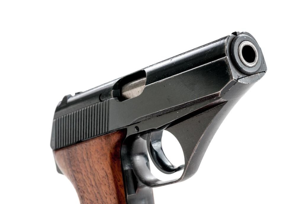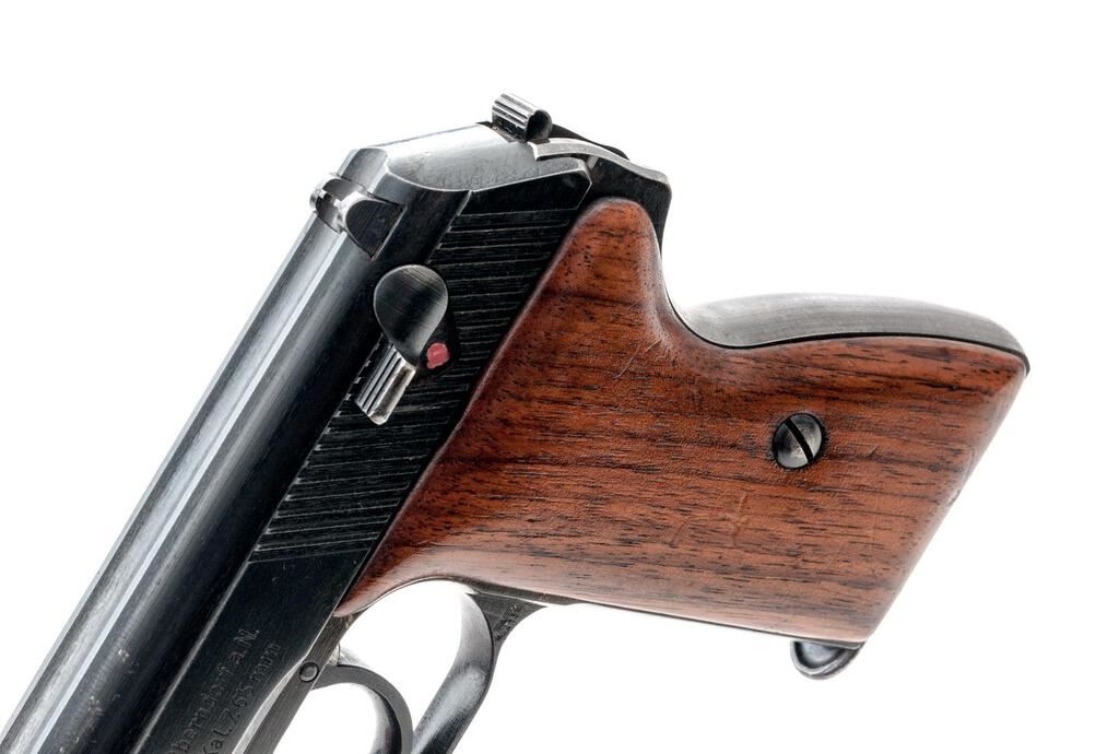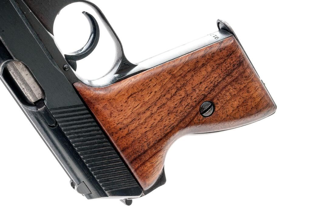 German Military Mauser HSC Semi-Automatic Pistol, with Extra Magazine, #912078, 7.65mm, 3.25" barrel, blued finish, smooth walnut grip panels, inverted "V" front sight and drift adjustable rear sight with "U" notch. Both magazines have base plates marked "MAUSER" with half-moon indented front tabs instead of the unmarked flat base types originally made for this late WWII variation. One shows some patina, otherwise both are in very good condition. Pistol is marked on left-side slide with "MAUSER" logo and "MAUSER-WERKE A.G. Oberndorf a.N./Mod. HSc/three lines/Kal.7,65 mm"; Army "Eagle/WaA 135" stamp on left side trigger guard; "(eagle)N" stamp on right-side slide and trigger guard. Grips are smooth uncheckered replacements. Condition overall is very good with the metal retaining approx. 90% finish, which shows holster patina around the slide at the muzzle and dark patina along the rear grip strap. Grips have had added varnish applied, now very good, showing light handling marks. Action operates smoothly, bright bore is good with worn rifling. No visible import marks. Est.: $500-$700. (C&R/PPT)