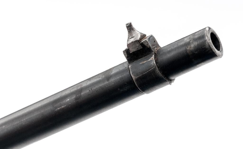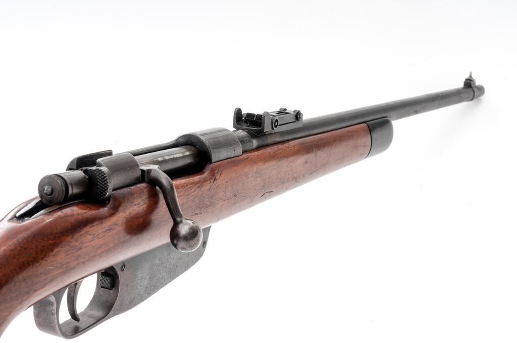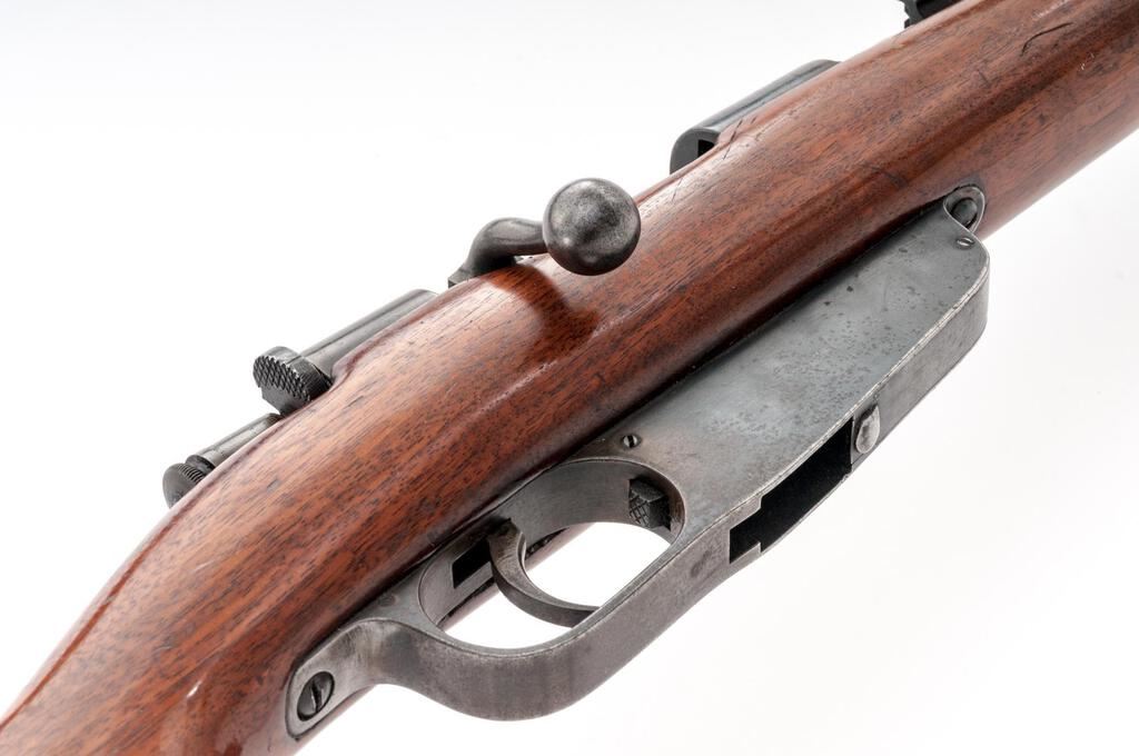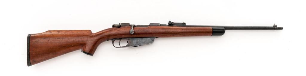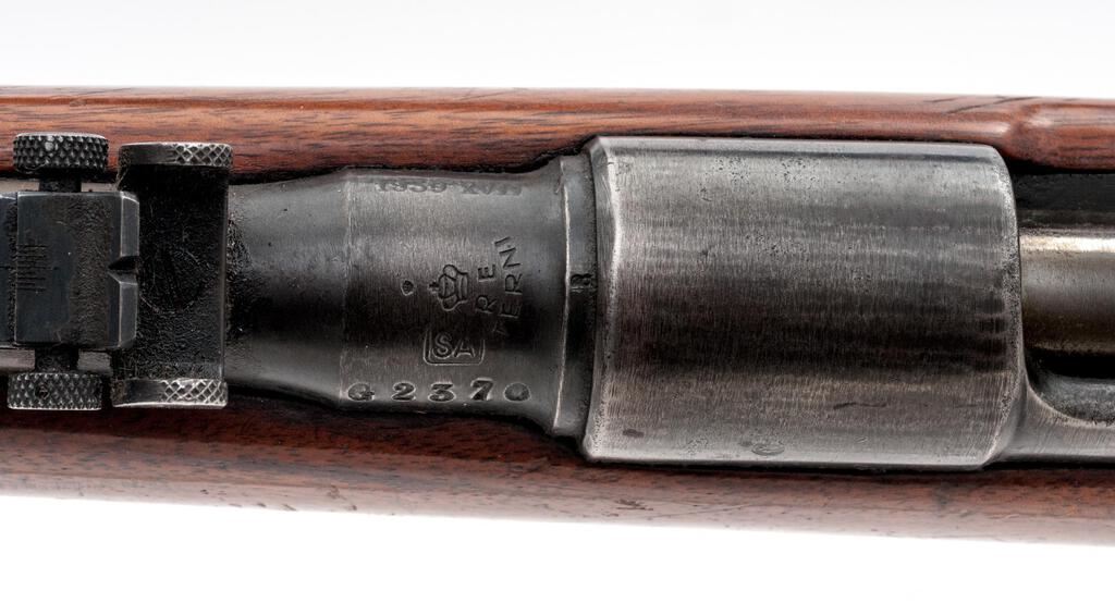 Modified Italian Model 1938 Mannlicher Carcano Bolt Action Rifle, #G2370, 7.35x51mm, 21" barrel, blued finish, walnut sporting stock with Monte Carlo cheekpiece and black forend tip. Issue military sights have been removed; front sight is a handmade post type sight; rear sight is a folding leaf "V"-notch with fine adjustment. Marked on top of barrel shank "(crown)/RE/TERNI", and on right side with the Fascist "1939 XVII". An "SA" Finnish property mark is stamped on the left side. Rifle has been modified by removing and replacing the military stock, hardware, etc. Condition overall is very good as modified with metal retaining approx. 60% finish. Stock is good with overall scratches and handling marks to the varnish finish. Action is smooth, bore has some darkening in the grooves with good rifling, and no visible import marks. Est.: $200-$300. (Modern)