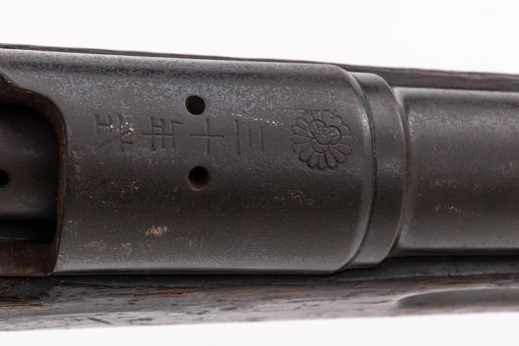 Japanese Type 30 Arisaka Bolt Action Rifle, #88661, 6.5x50mm, 31.1" barrel, blued finish, two-piece hardwood stock set, inverted "V" front sight and adjustable folding leaf rear sight with "V" notch. Missing cleaning rod, magazine floorplate and magazine spring. Marked on top of receiver ring with punch-defaced Imperial mum crest over characters for "30 Type". Left-side receiver rail marked with the symbol for the Koishikawa Arsenal. Right-side buttstock stamped with "110" rack number. Mismatched number on bolt handle. Buttplate has been polished bright and does not fit properly. Condition overall is fair with the remainder of the metal covered with patina. Wood is fair showing a crack at the wrist and overall dents, scuffs, and handling marks to the dark finish. The dark bore is poor with overall pitting. The safety will not engage, otherwise the bolt operates smoothly. No visible import marks. Est.: $300-$500. (C&R)