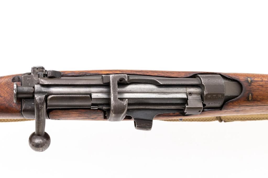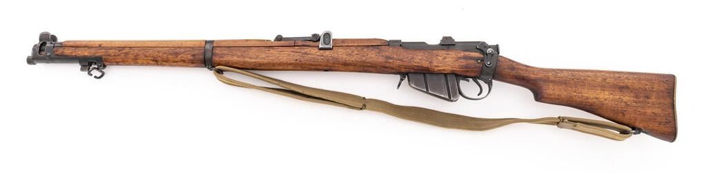 Australian No. 1 Mk III* Lee-Enfield Bolt Action Rifle, #48018, .303 Brit. cal., 25.2" barrel, phosphate/blued finish, hardwood stock set, blade front sight with protectors and adjustable tangent rear sight. Marked on right-side action body with 7-pointed star over shield containing "LITHGOW/SHT.LE/III*/1916", and "MA 57" on the left side. Matching numbers on bolt handle, other numbers mismatched. An early Number 3 magazine and cutoff is fitted and a reproduction brass disc is screwed to the buttstock. A very good condition British WWII cotton sling is attached. Condition overall is very good, the metal retaining approx. 85% of its partial refinish, with the magazine toning to a brown color. There is a chip missing from the left-side forend, and the wood has been sanded and oiled over old handling marks, otherwise good. Action operates smoothly, bright bore is excellent with sharp well-defined rifling. Import stamped on right side of receiver. Est.: $400-$700. (C&R)