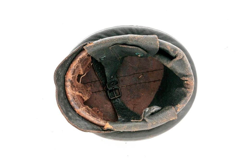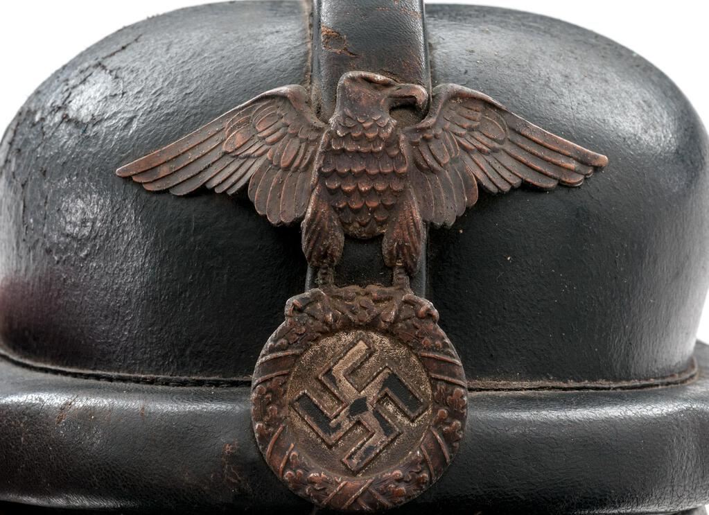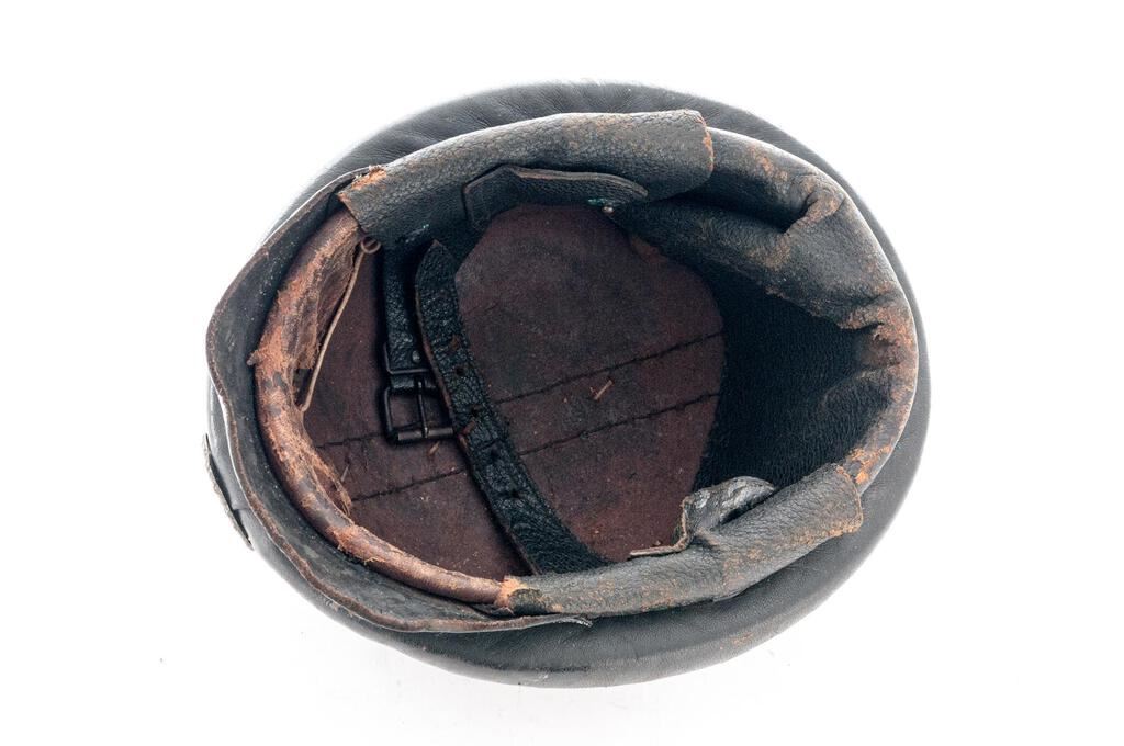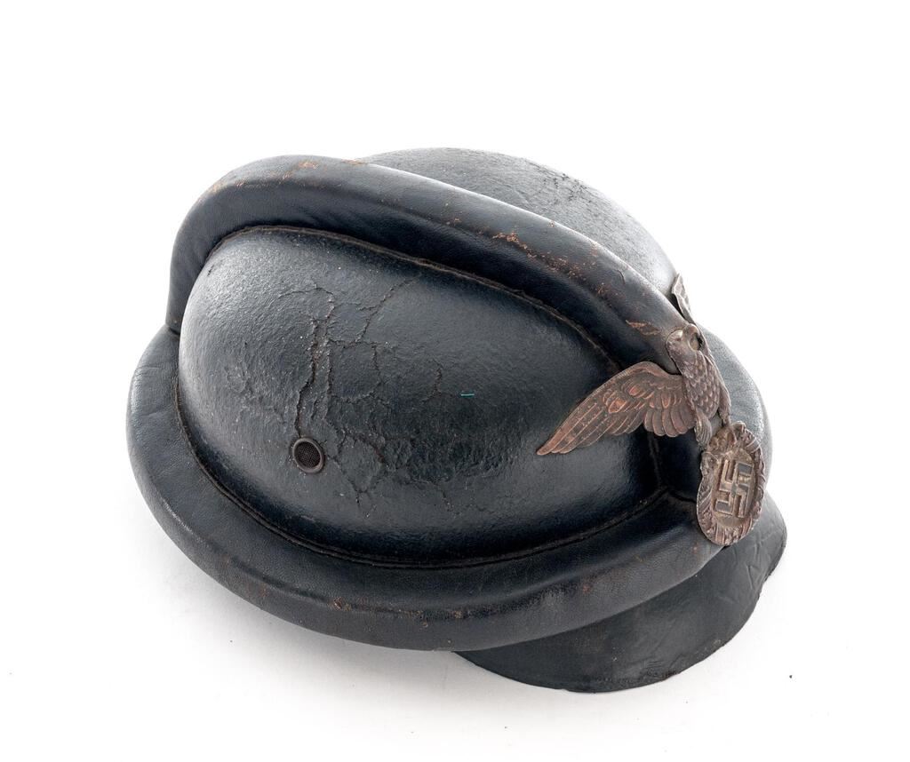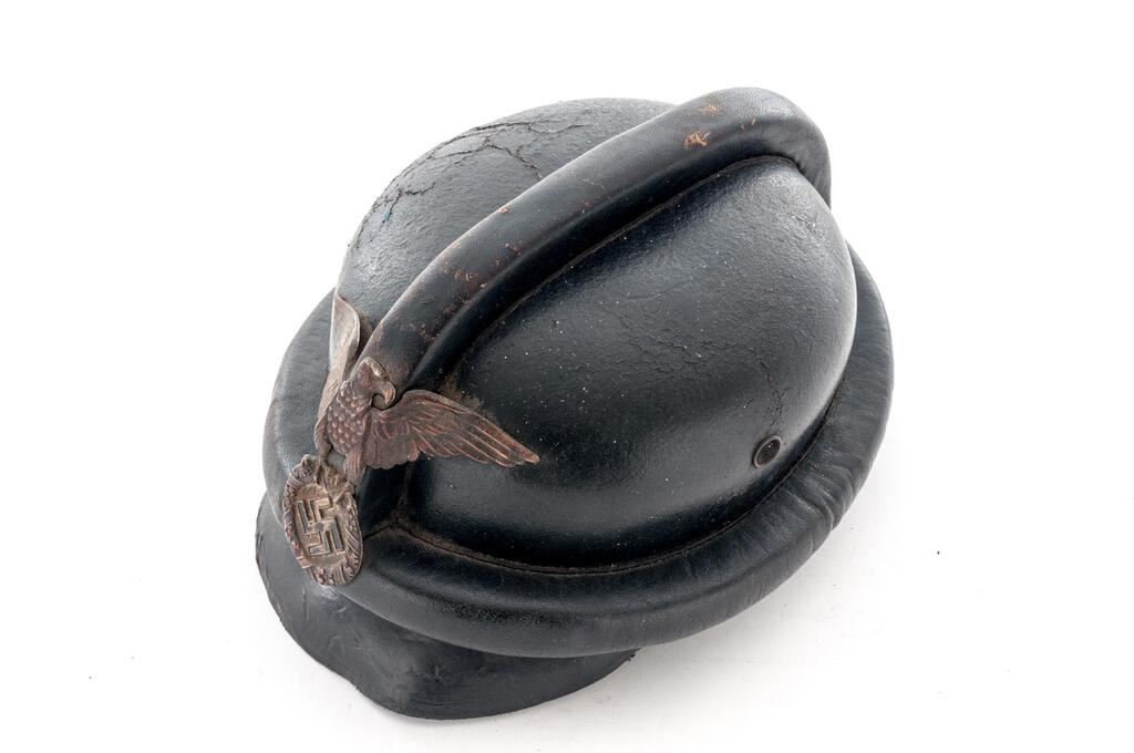 Early German NSKK Motorcycle Crash Helmet, for the NSKK motorcycle riders, with 1st pattern large Nazi eagle front plate, black leather body with padded outer rim and padded top ridge, wire mesh vent holes, thick leather neck guard, wide leather chinstrap to cover the ears with roller buckle, nine-tongue leather liner with broken tie string, thick patent leather visor. Condition is fair to good but showing age, the body showing some crazing, light cracking, and soiling; visor is stiff and shows shrinkage to the patent leather coating, the eagle has lost most of its silver wash and is fading to a dark copper color, with losses to the black paint in the swastika. Neck guard shows scuffs and cracking to the rear edge, chinstraps show age and minor cracking and scuffs, with some verdigris around the snaps. Liner shows much age, cracking, and scuffs. Faint maker's ink stamp on neck guard and marked size 57 on the liner. Est.: $300-$500.