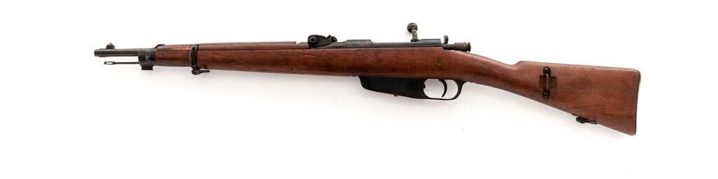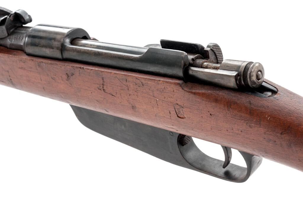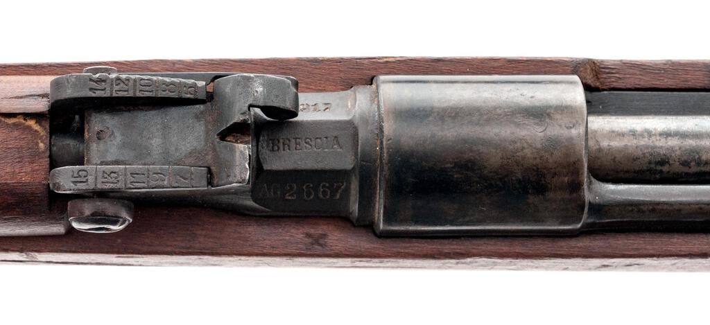 Italian Model 1891 Moschetto Carcano Bolt Action Carbine, #AG2667, 6.5x52mm, 17.7" barrel, blued finish, hardwood stock set, inverted "V" front sight and adjustable leaf rear sight with "V" notch. Underside of stock cut for bayonet blade, and front band has small tab on top to secure hand guard. Cleaning rod is mounted under the barrel. Marked on top of barrel flat "BRESCIA", and "1917" on the right side. Left-side forend stamped with boxed "Op" mark; left-side buttstock stamped with cartouche over "REPARAZIONE 1938" repair mark ahead of matching stamped serial number. Mismatched number stamped on top of bolt handle. Condition overall is very good with the metal retaining approx. 80% finish, showing a mottled appearance to the receiver ring and patinaed parts. Wood is very good with overall handling marks to the even colored finish. Action operates smoothly; bore has darkening in the grooves with frosting forward of the chamber that may clean better. No visible import marks. Est.: $400-$600. (C&R)