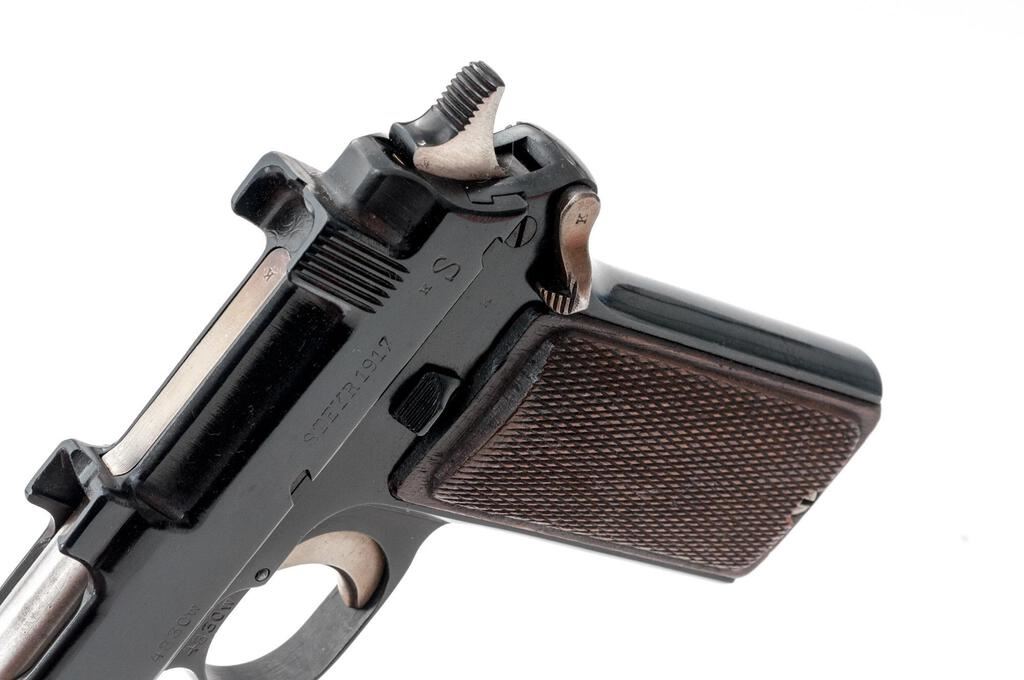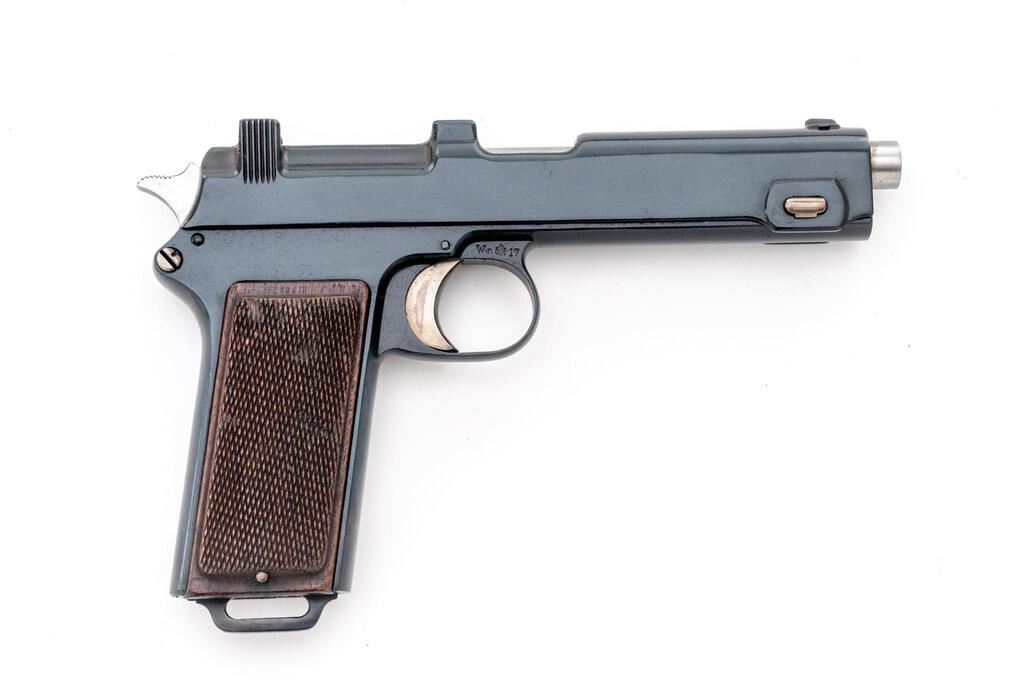 Austrian Steyr Model 1912 Semi-Automatic Pistol, #4830W, 9mm Steyr cal., 5" barrel, blued finish, checkered walnut grips, drift adjustable blade front sight and fixed "V"-notched rear sight. Marked on left-side slide "STEYR 1917". Right-side trigger guard web marked "W-n(Austrian eagle)17". Matching numbers on frame and slide. Condition overall is good as refinished, with the metal retaining almost all of its dark re-blue. Grips are good showing impressions and flattening to the checkering. Action operates smoothly; bore has areas of pitting, otherwise bright with good rifling. No visible import marks. Est.: $400-$600. (C&R/PPT)